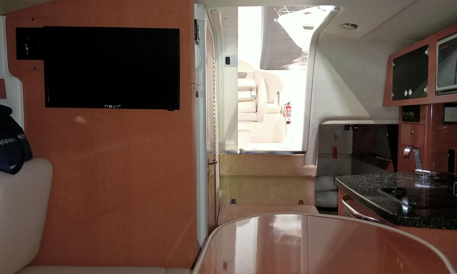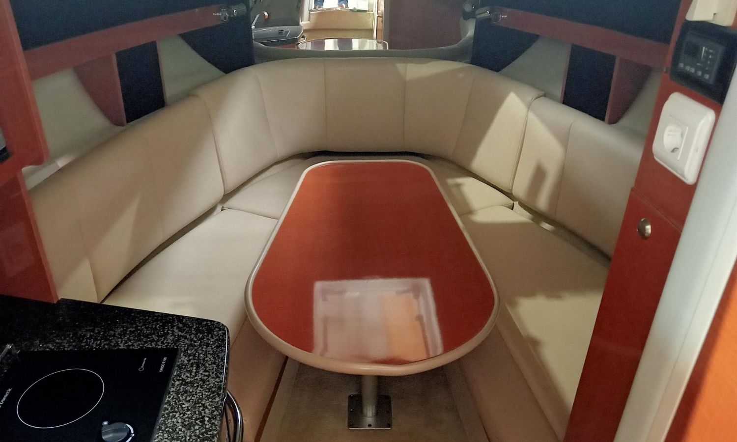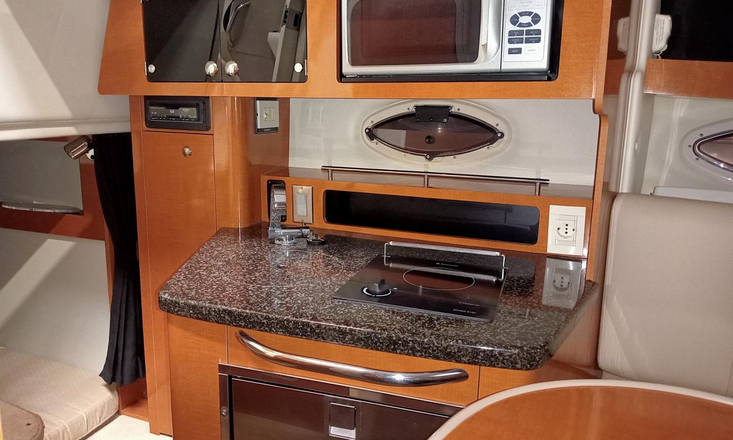 Electric windlass - Electric winches - Shore power connection + battery charger - Air conditioning - Bimini top + full hardware kit - GPS/chart plotter/depth sounder - Radar - VHF radio - Audio system - TV + aerial - Galley - Fridge - Sink - Microwave - Bow sun deck cushions - Stern shower - Marine toilet with waste tank.Boat description