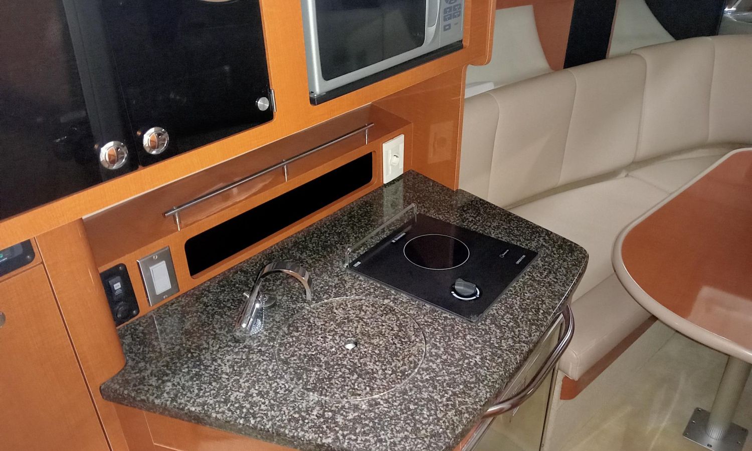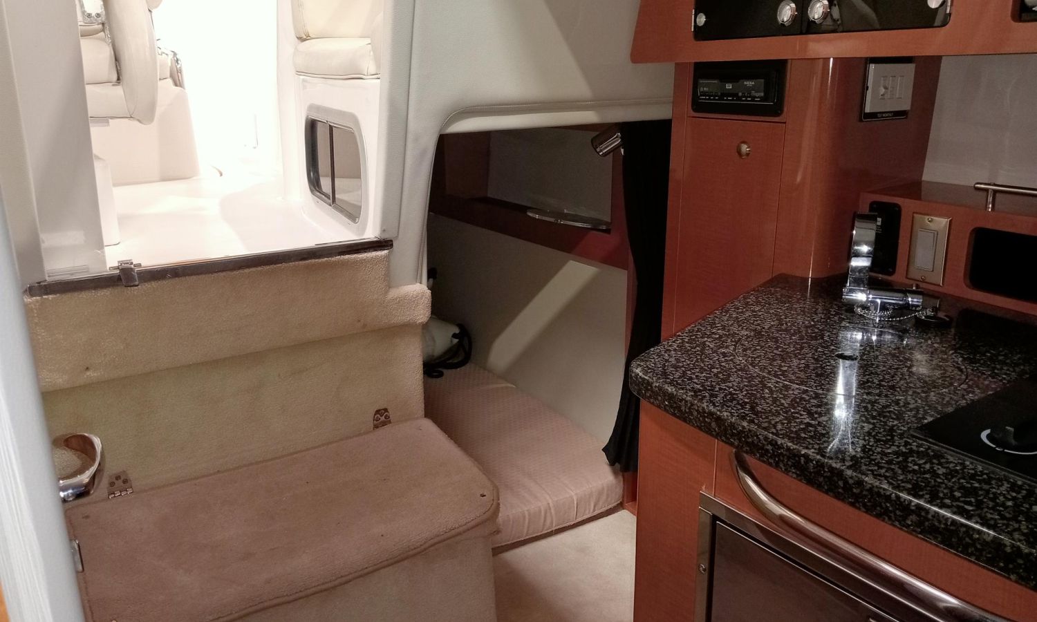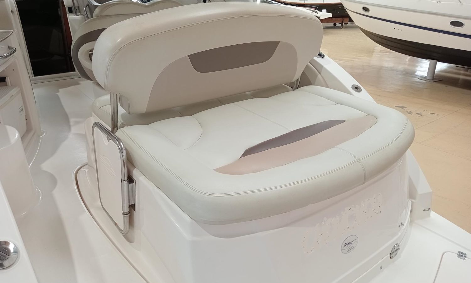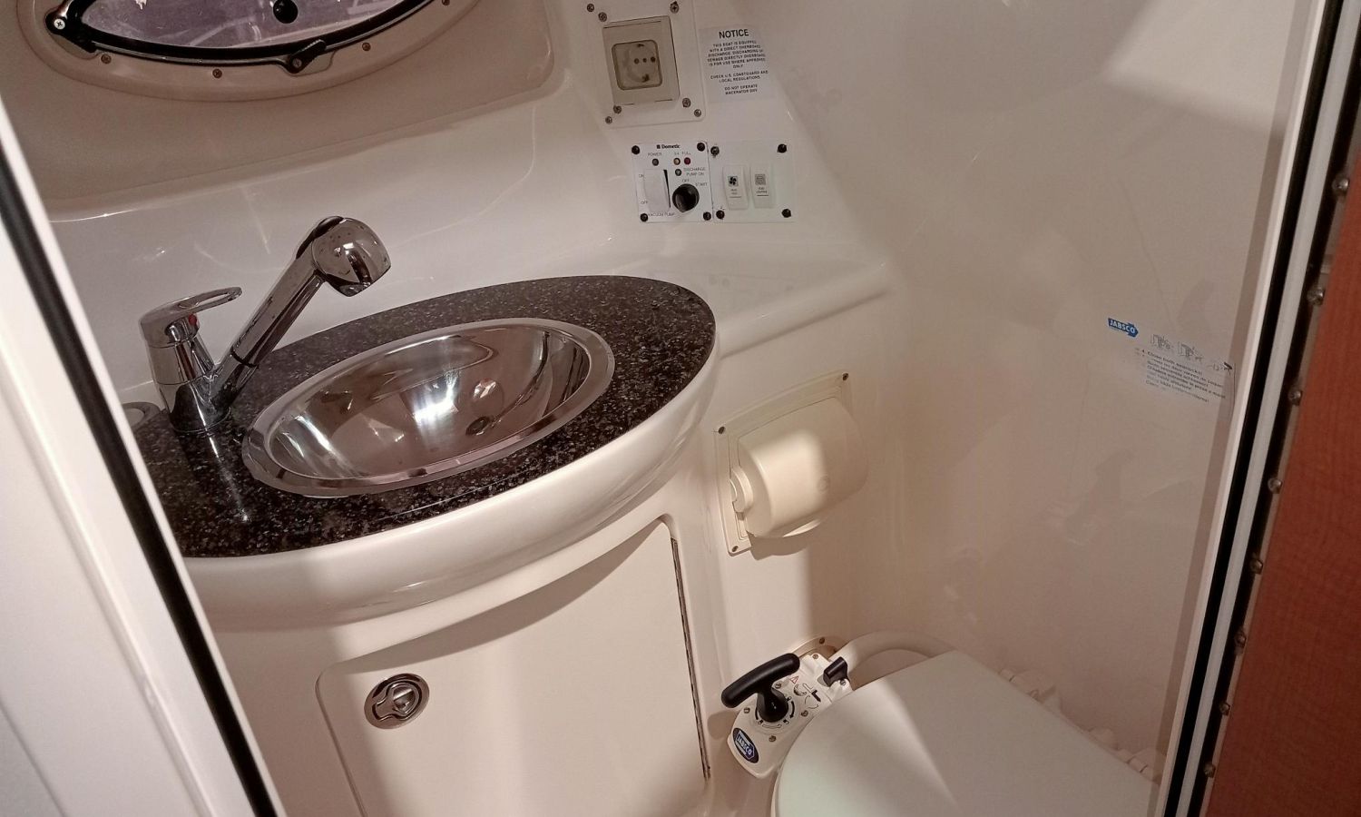 Electric windlass - Electric winches - Shore power connection + battery charger - Air conditioning - Bimini top + full hardware kit - GPS/chart plotter/depth sounder - Radar - VHF radio - Audio system - TV + aerial - Galley - Fridge - Sink - Microwave - Bow sun deck cushions - Stern shower - Marine toilet with waste tank.Boat description