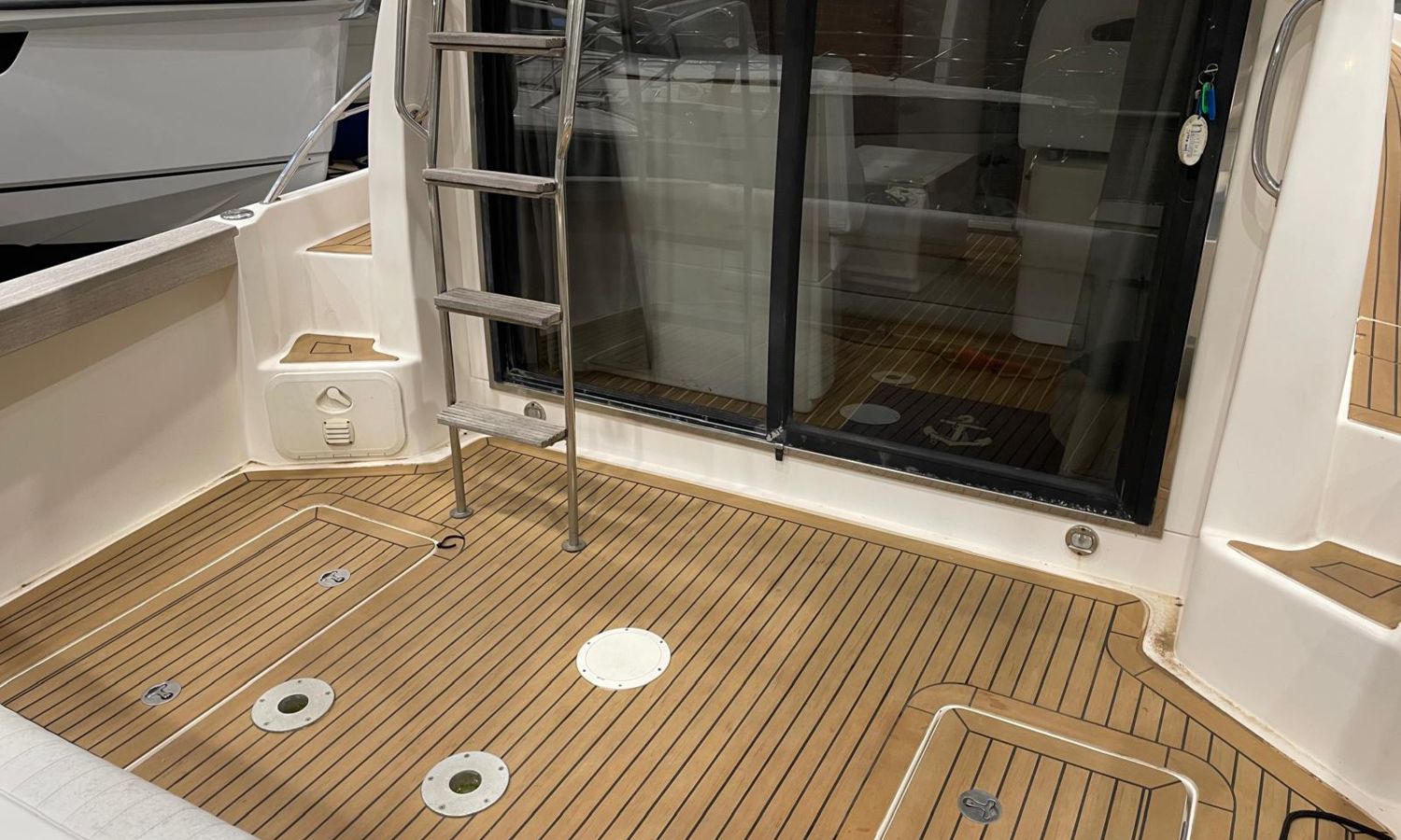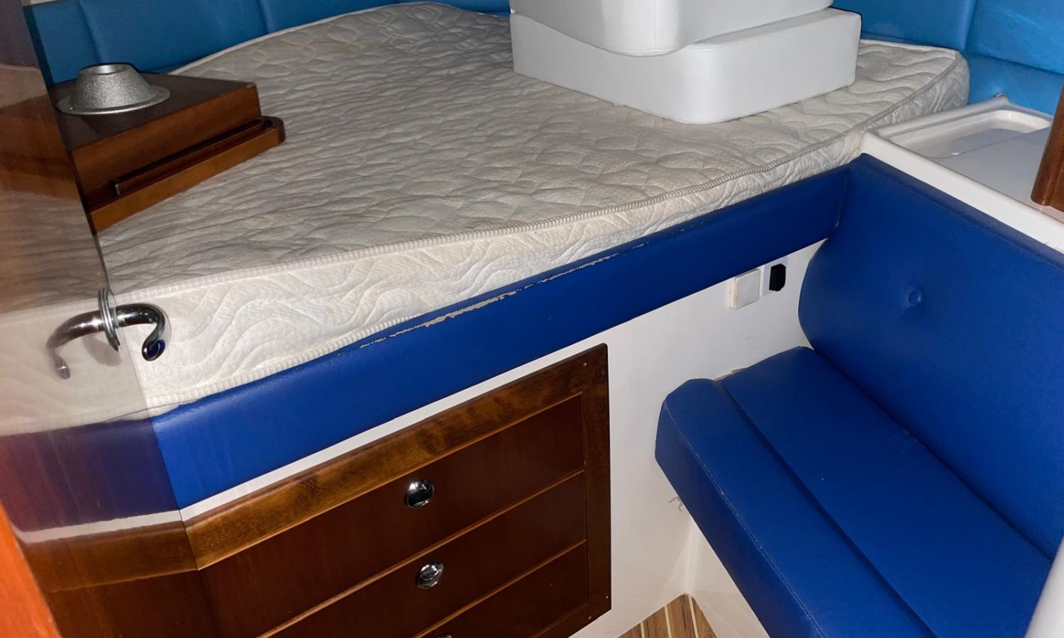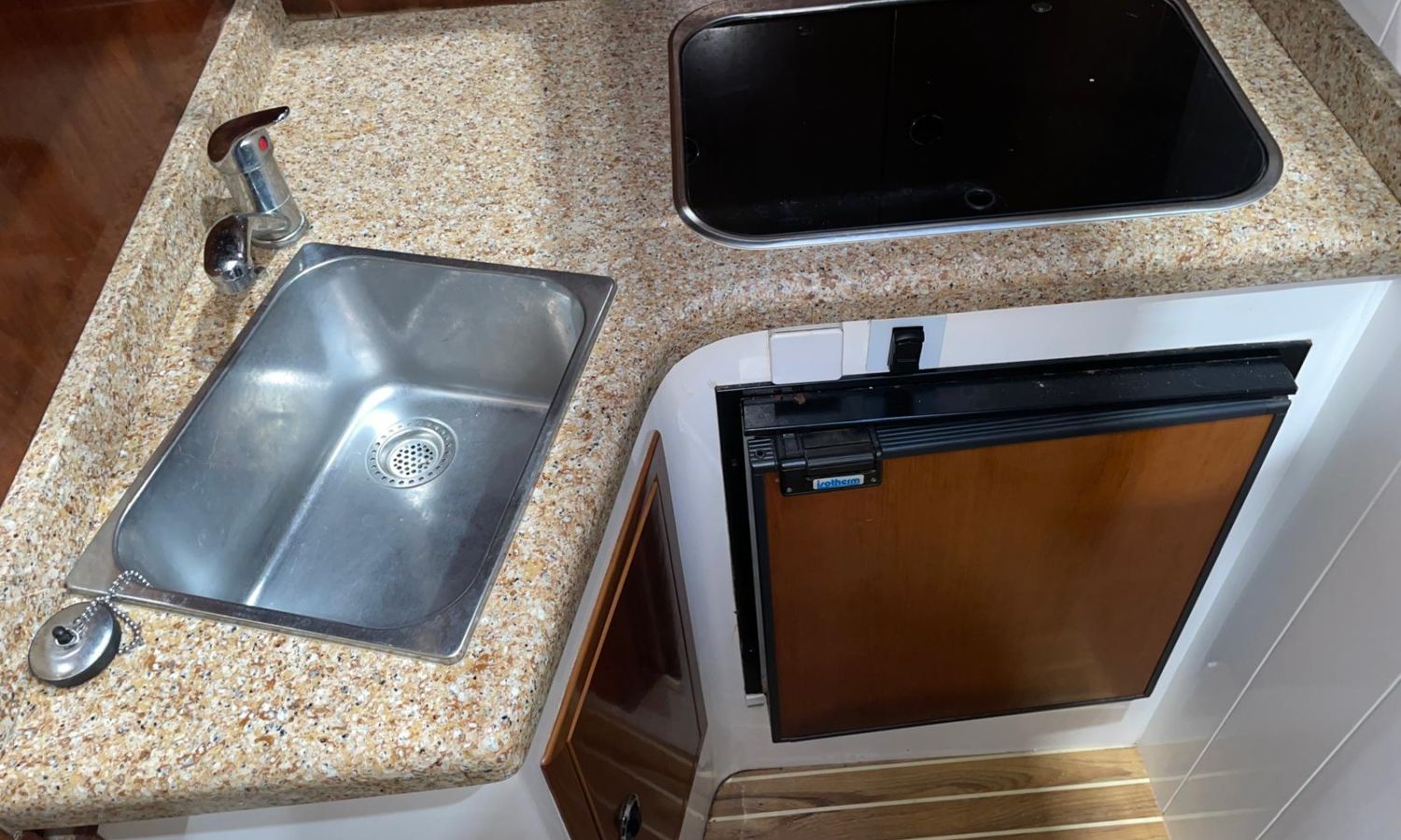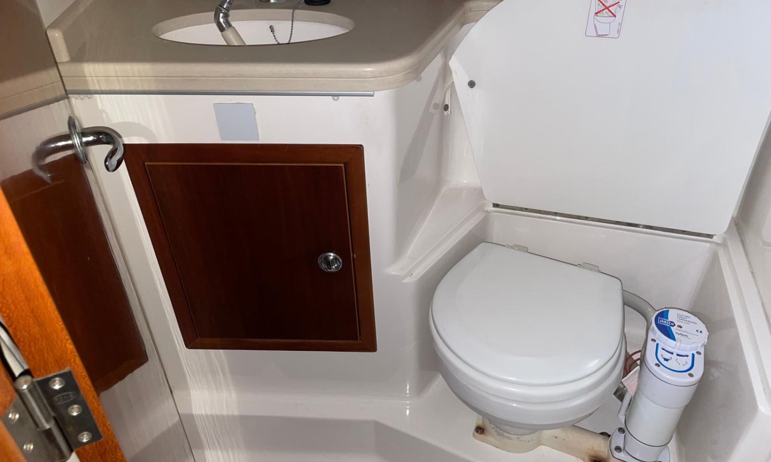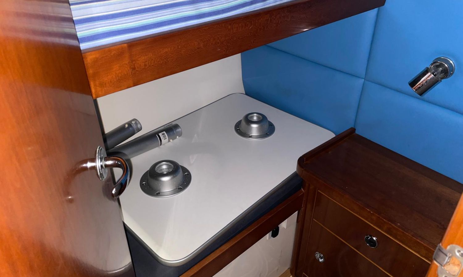 Bathing platform with ladder - Stern shower - Teak - 220 V. port socket - Battery charger - Cockpit table - Bow sundeck cushions - Compas - Gps/Plotter/Deep finder - Autopilot - VHF - Bow thruster - Audio equipement - Electric anchor windlass - 2 cabins - Marine toilet - Induction hob - Sink - Refrigerator - Antifouling.Boat description