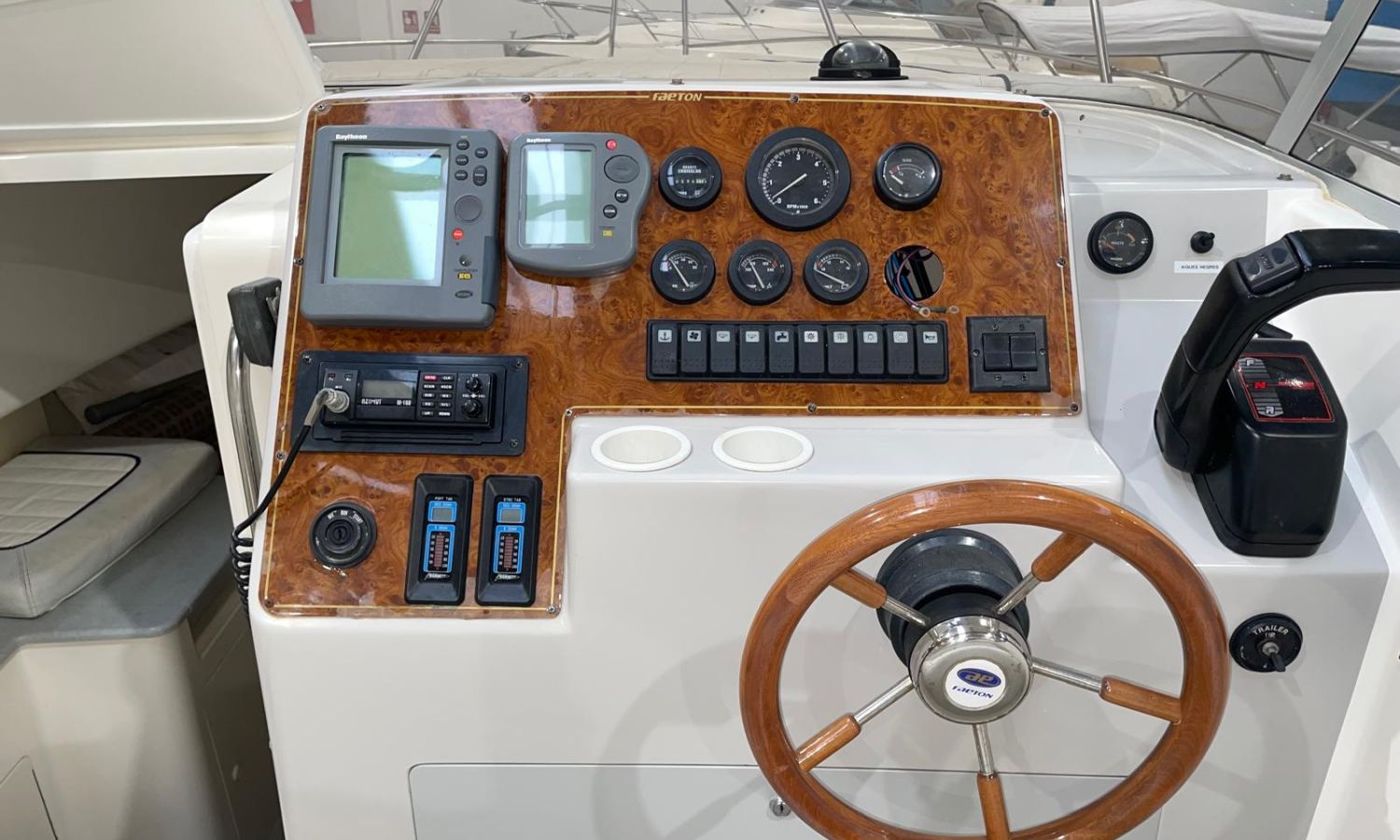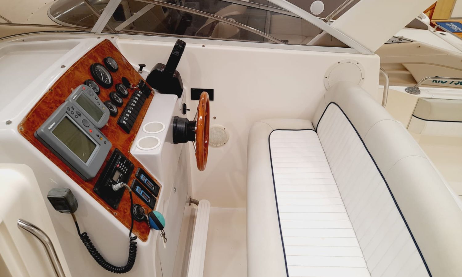 Bimini top - Bathing platform - Stern shower - Table in the bathtub - Sink - Electric windlass - Flaps - Bow cushions - Fridge 12 V. - Gas stove - Audio equipment - Ski mast - Deep finder - VHF - Wc with black water tank - Antifouling.Boat description