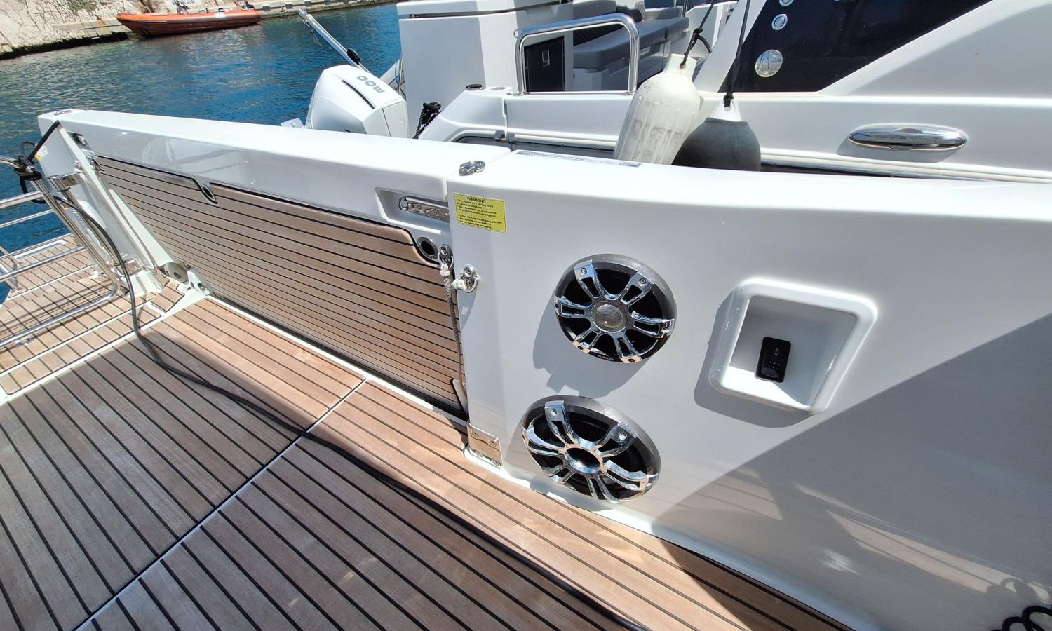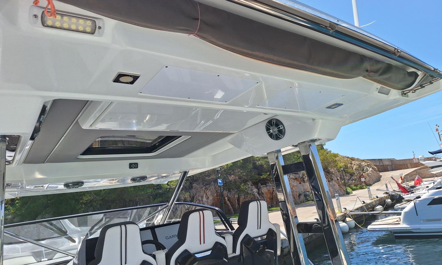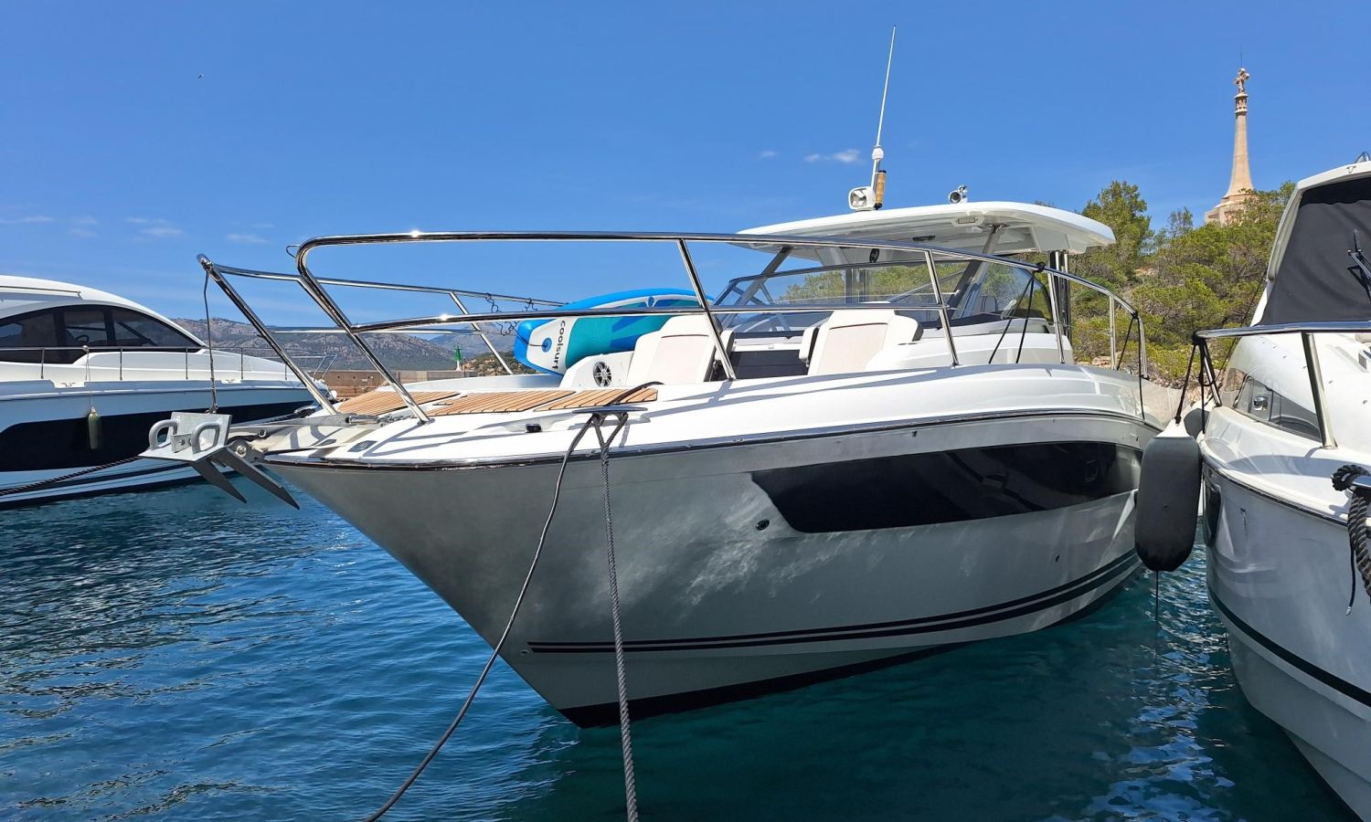 T-top - Cockpit cover - Bimini top - Bow thruster - Trim tabs - Offshore power 220 V - Battery charger - Bow sun cushions - WC with waste water tank - Electric anchor winch - Cockpit table - Teak - Gps/Plotter/Deep finder - Electronic controls - Audio equipment - VHF - Beacon - Stern shower - Gas stove - Refrigerator 12 V/220 V - Microwave oven - Exterior water intake.Boat description