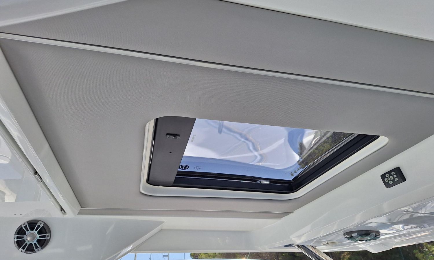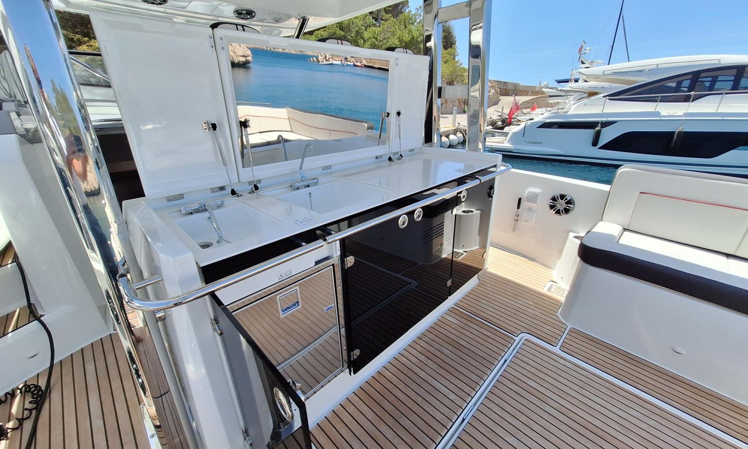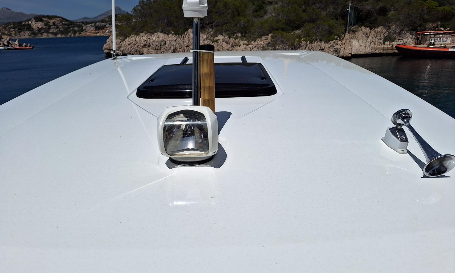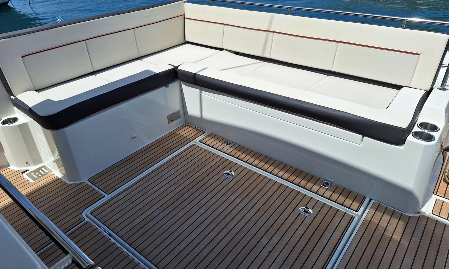 T-top - Cockpit cover - Bimini top - Bow thruster - Trim tabs - Offshore power 220 V - Battery charger - Bow sun cushions - WC with waste water tank - Electric anchor winch - Cockpit table - Teak - Gps/Plotter/Deep finder - Electronic controls - Audio equipment - VHF - Beacon - Stern shower - Gas stove - Refrigerator 12 V/220 V - Microwave oven - Exterior water intake.Boat description