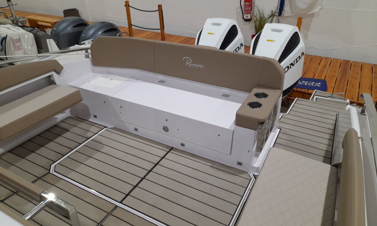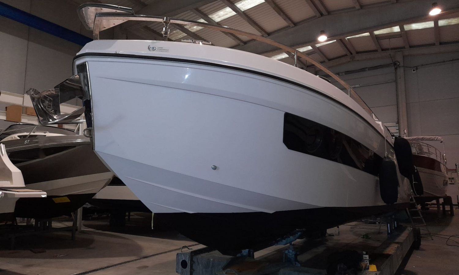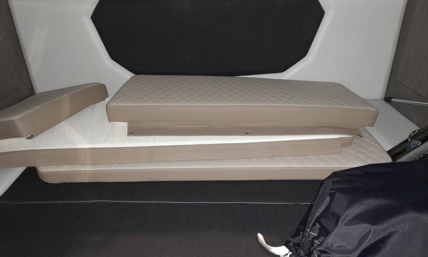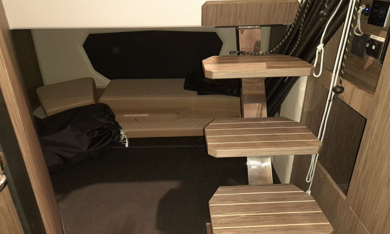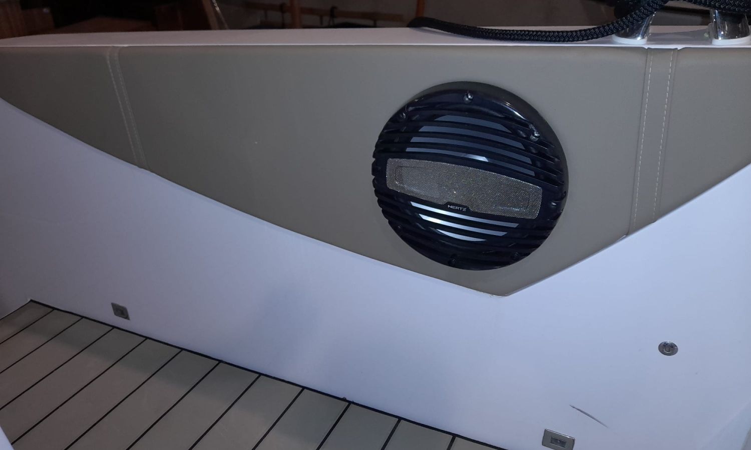 Bimini top - Stern shower - Stern platform with bathing ladder - Seadeck - Stern sundeck - Bow sun cushions - Cockpit table - Wet-bar with sink - Cockpit refrigerator 12 V - Gas stove - Water heater - GPS/Plotter/Deep Finder - Bow thruster - Autopilot - VHF - Audio equipment - Electronic controls - Electric anchor winch with anchor and chain - Offshore power 220 V - Bow thruster - Battery charger - Electric marine WC with waste water tank - Cabin - Cockpit cover - Antifouling.Boat description