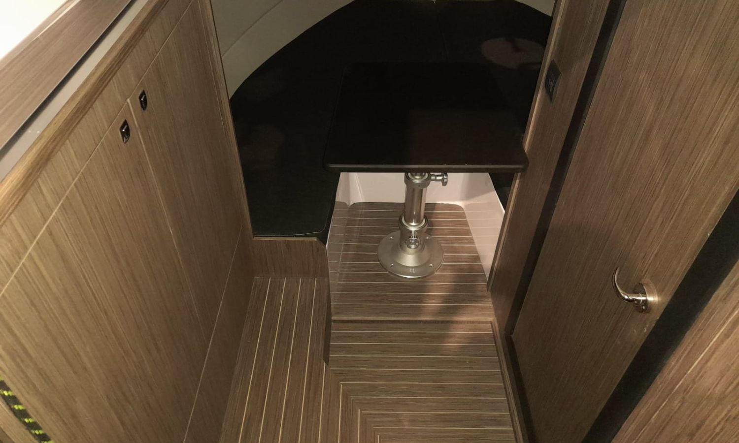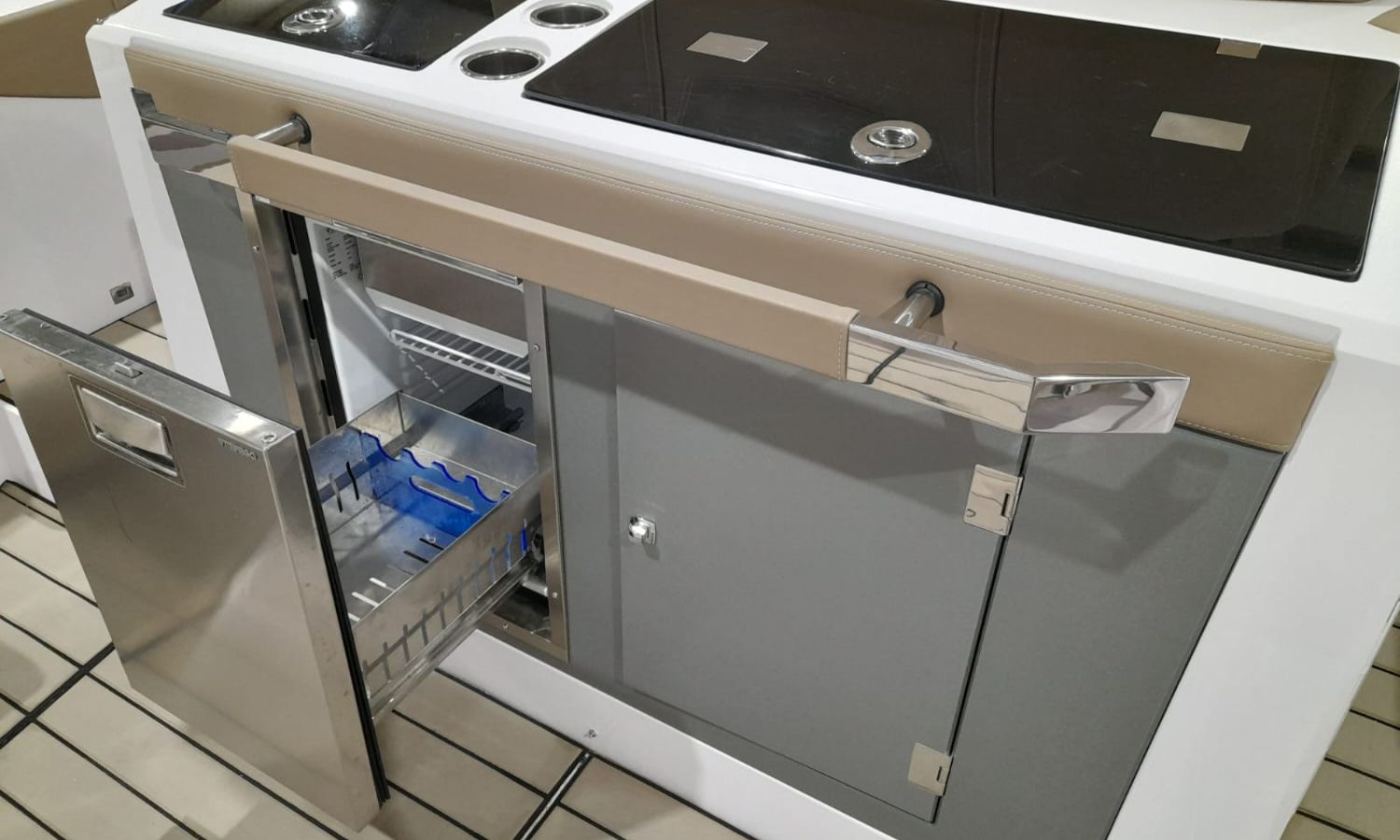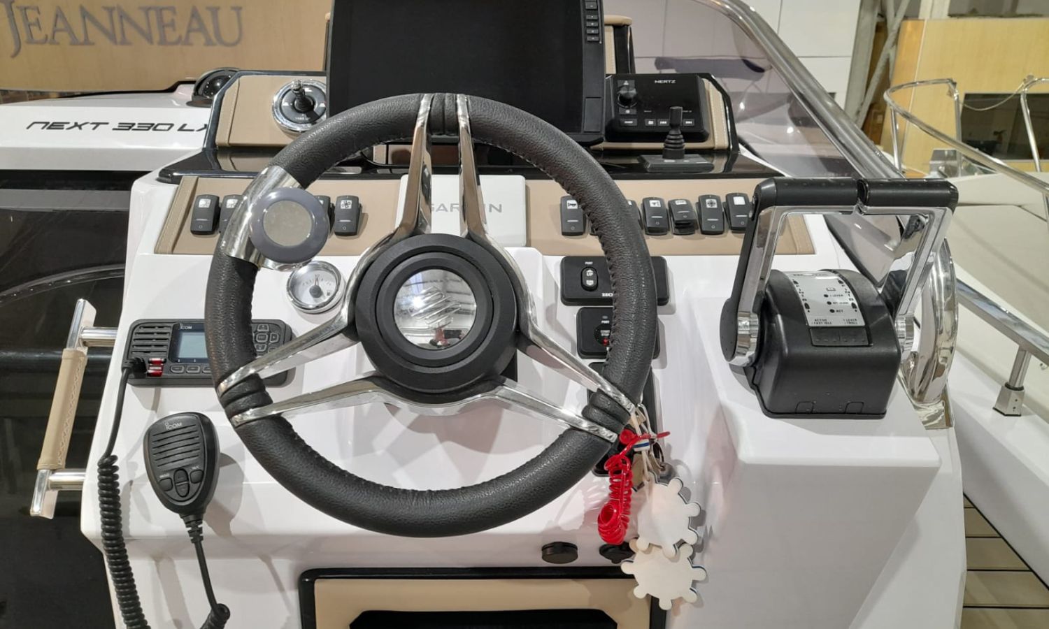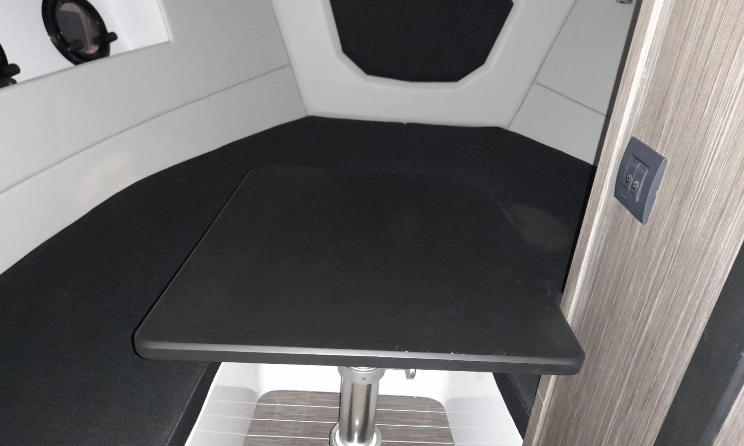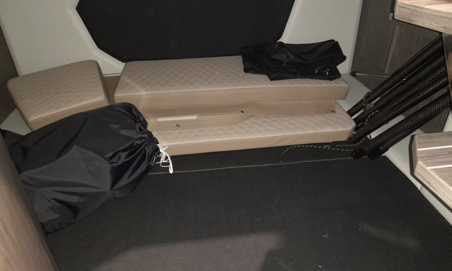 Bimini top - Stern shower - Stern platform with bathing ladder - Seadeck - Stern sundeck - Bow sun cushions - Cockpit table - Wet-bar with sink - Cockpit refrigerator 12 V - Gas stove - Water heater - GPS/Plotter/Deep Finder - Bow thruster - Autopilot - VHF - Audio equipment - Electronic controls - Electric anchor winch with anchor and chain - Offshore power 220 V - Bow thruster - Battery charger - Electric marine WC with waste water tank - Cabin - Cockpit cover - Antifouling.Boat description