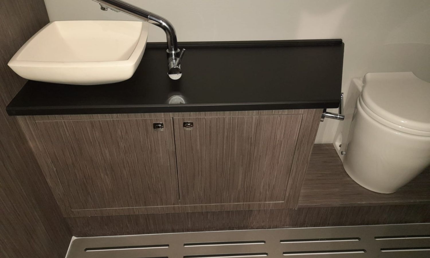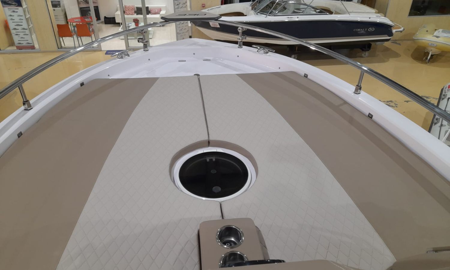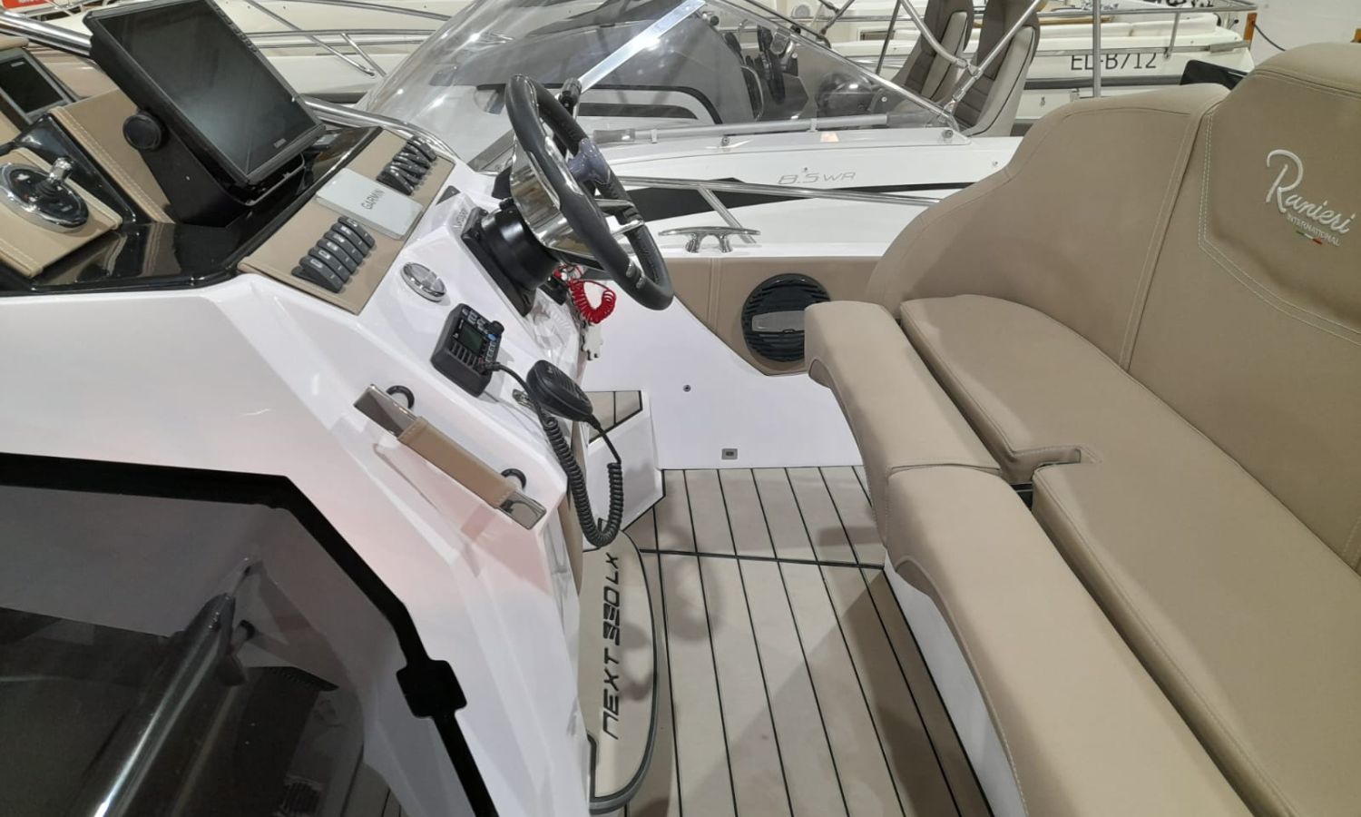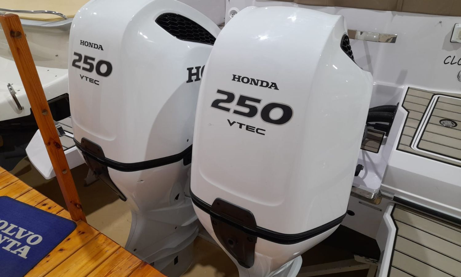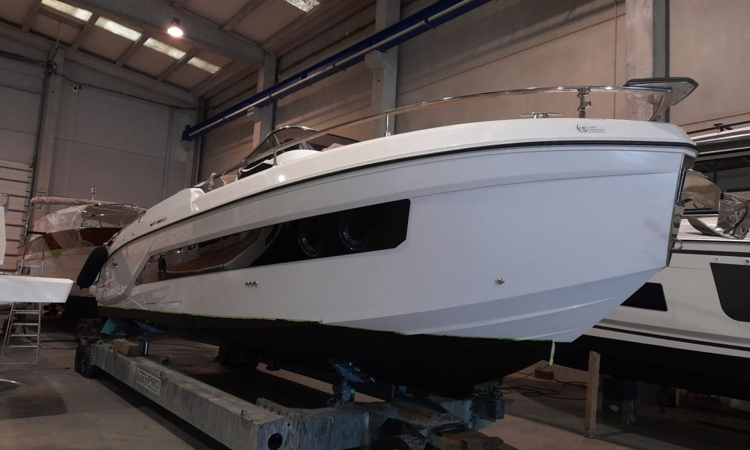 Bimini top - Stern shower - Stern platform with bathing ladder - Seadeck - Stern sundeck - Bow sun cushions - Cockpit table - Wet-bar with sink - Cockpit refrigerator 12 V - Gas stove - Water heater - GPS/Plotter/Deep Finder - Bow thruster - Autopilot - VHF - Audio equipment - Electronic controls - Electric anchor winch with anchor and chain - Offshore power 220 V - Bow thruster - Battery charger - Electric marine WC with waste water tank - Cabin - Cockpit cover - Antifouling.Boat description