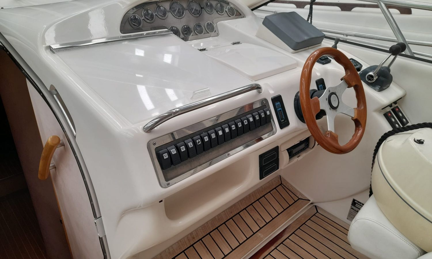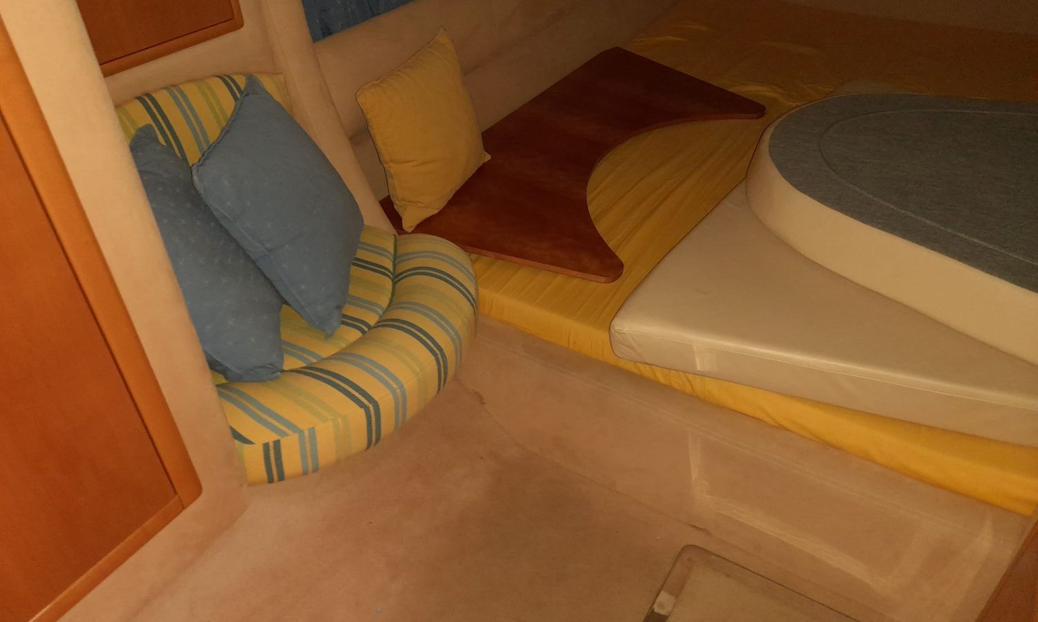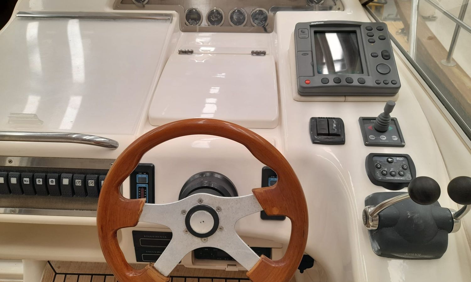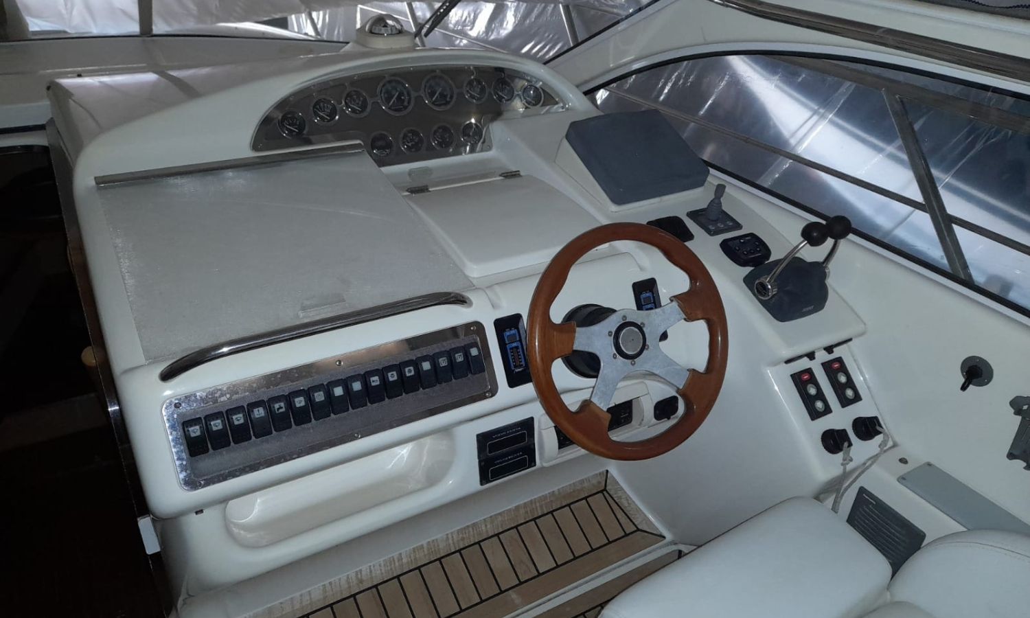 Bow Thruster - Trim tabs - Port socket 220 V. - Battery charger - Water heater - Cockpit and bathing platform Flexiteek - Fridge 12 V. - Electric anchor windlass - Bow sunbathing cushions - Stern shower - Cockpit table - Gps/Plotter/Sounder - Autopilot - Electronic controls - Flaps - Rudder Angle Indicator - Compass - VHF Radio - Audio Equipment - Pirate Light - 2 Cabins - WC Marine Wc With Sewage Tank And Shower - Electric Kitchen - Sink - Refrigerator.