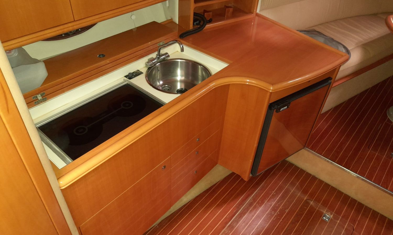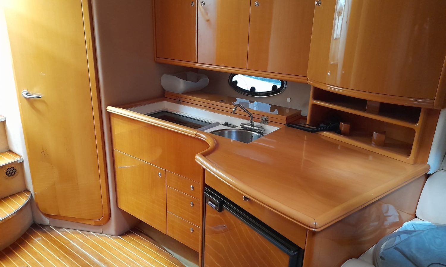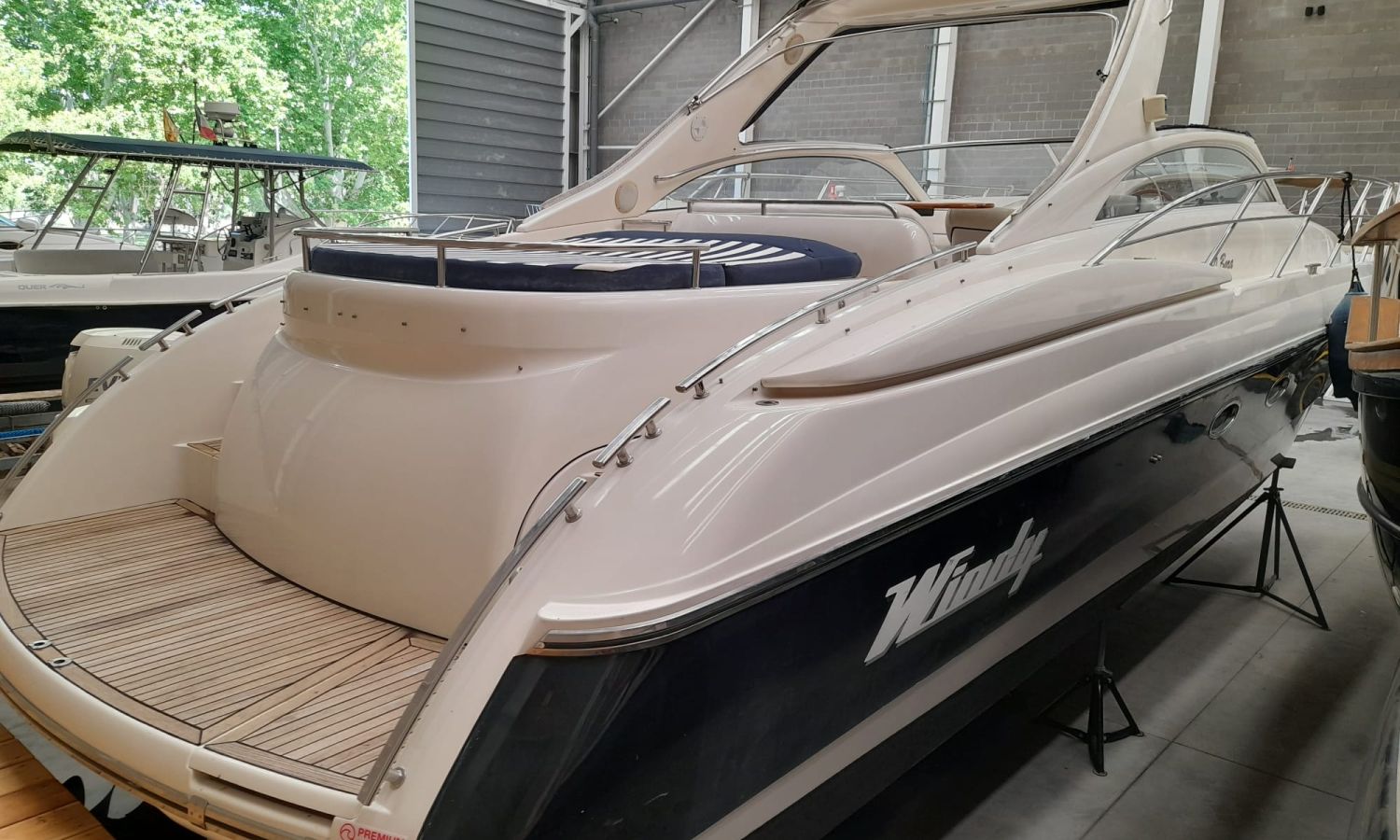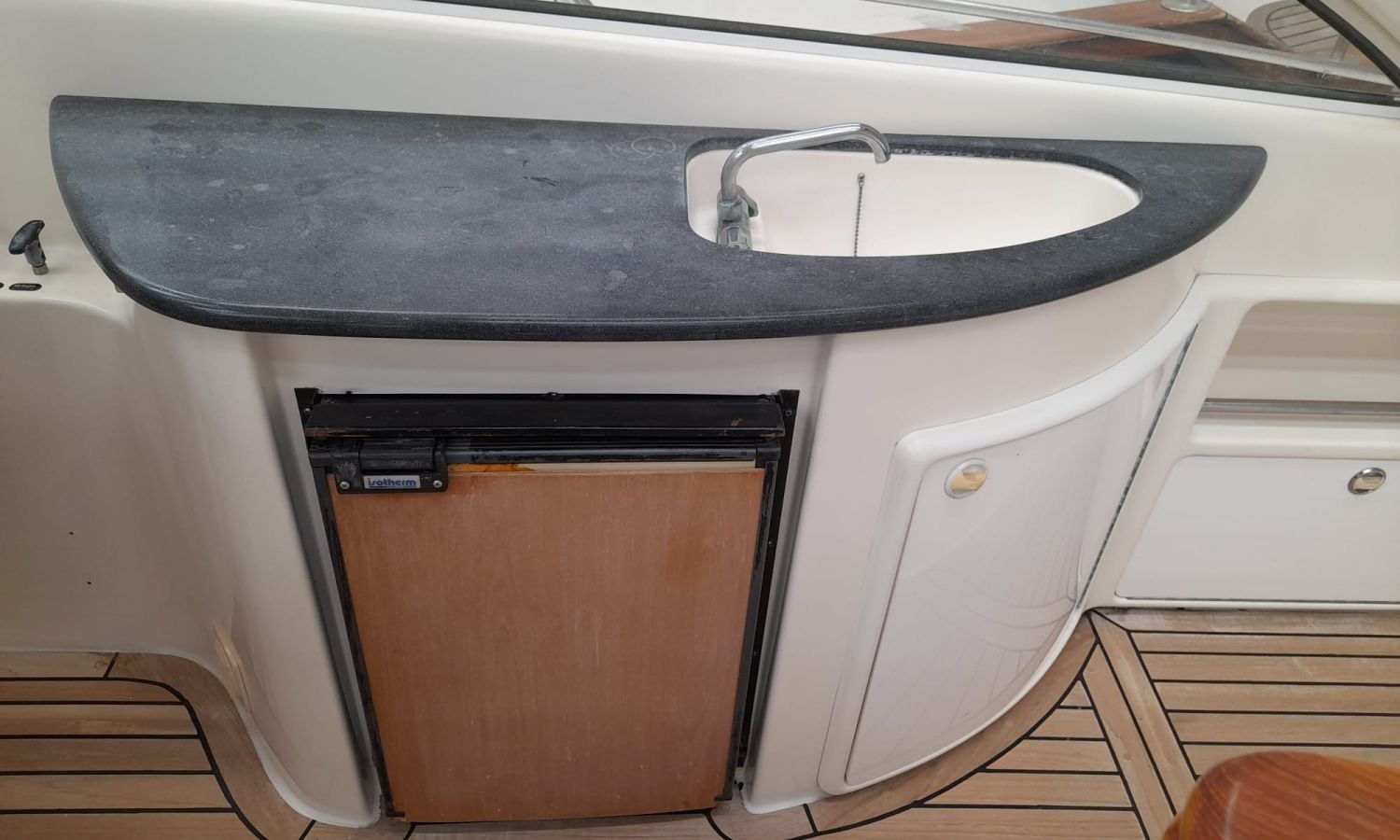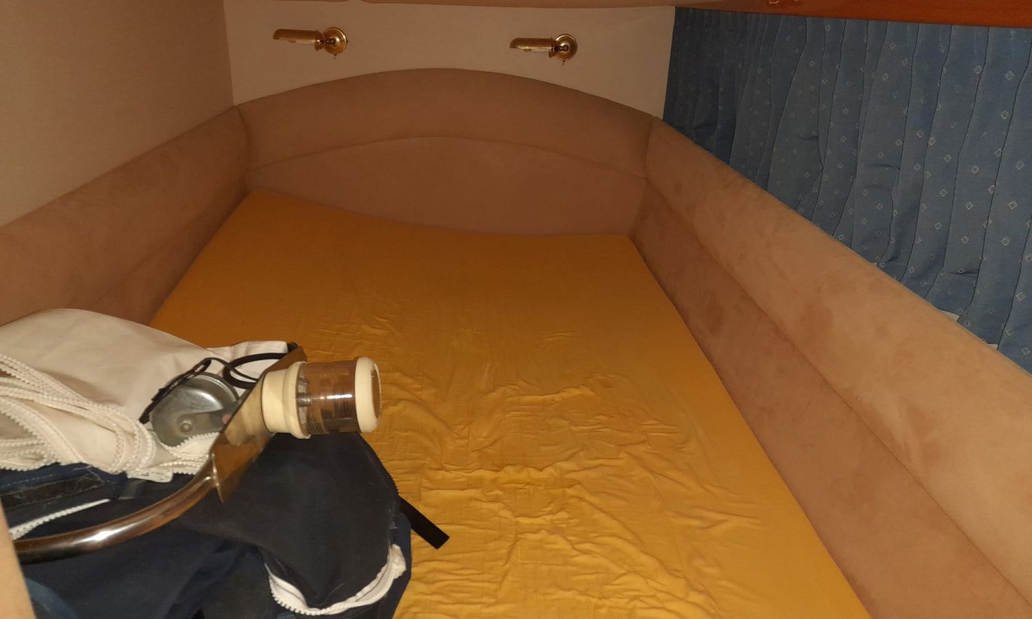 Bow Thruster - Trim tabs - Port socket 220 V. - Battery charger - Water heater - Cockpit and bathing platform Flexiteek - Fridge 12 V. - Electric anchor windlass - Bow sunbathing cushions - Stern shower - Cockpit table - Gps/Plotter/Sounder - Autopilot - Electronic controls - Flaps - Rudder Angle Indicator - Compass - VHF Radio - Audio Equipment - Pirate Light - 2 Cabins - WC Marine Wc With Sewage Tank And Shower - Electric Kitchen - Sink - Refrigerator.