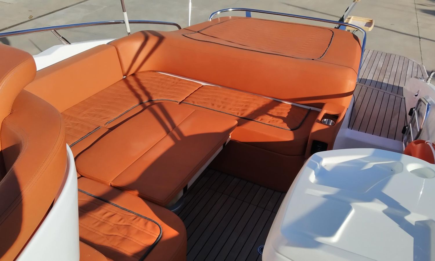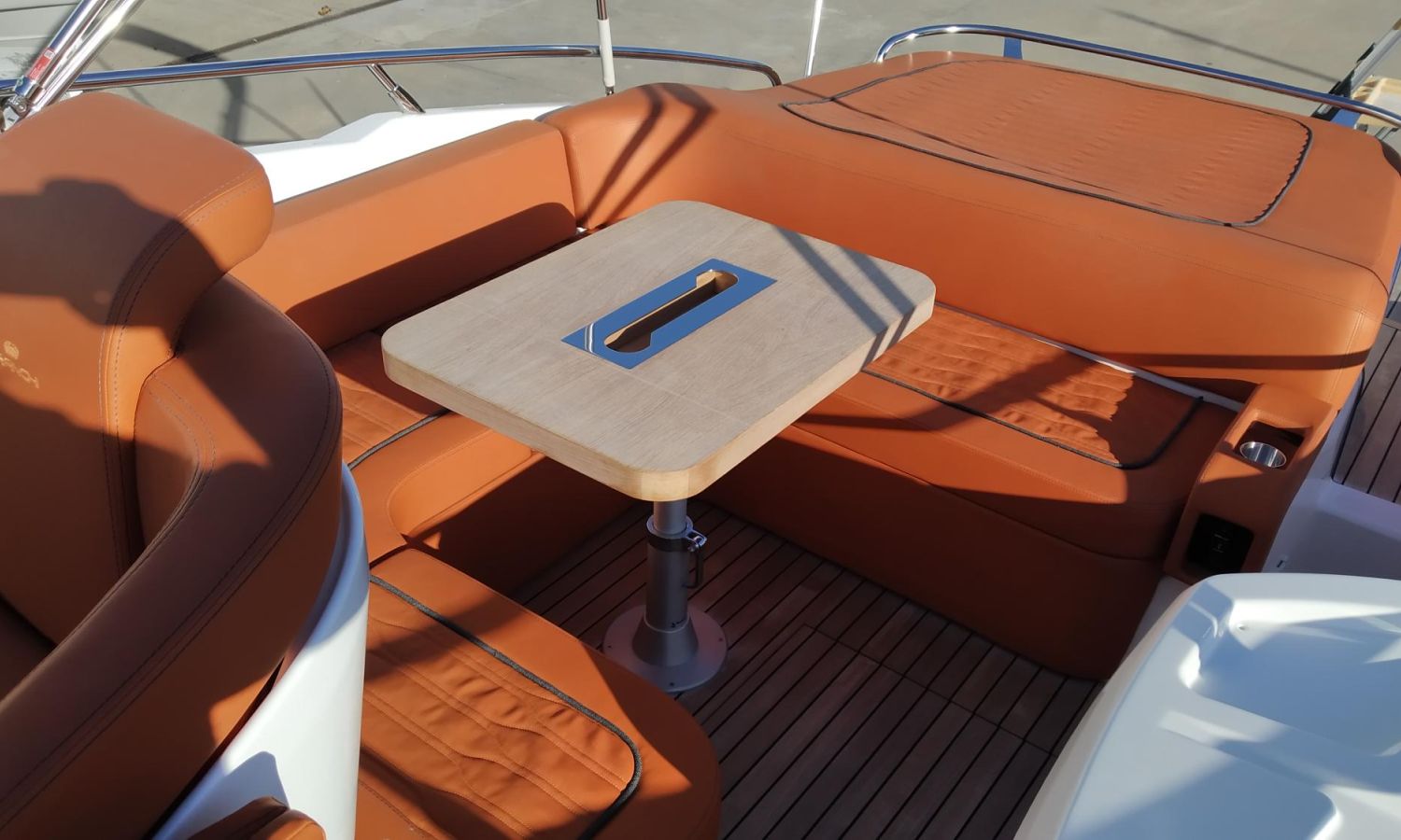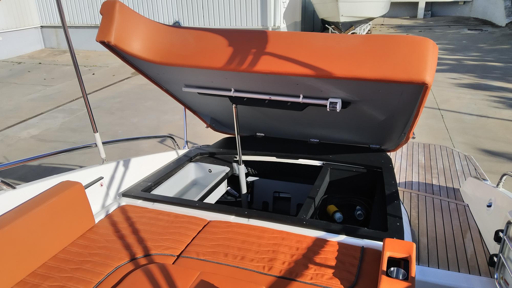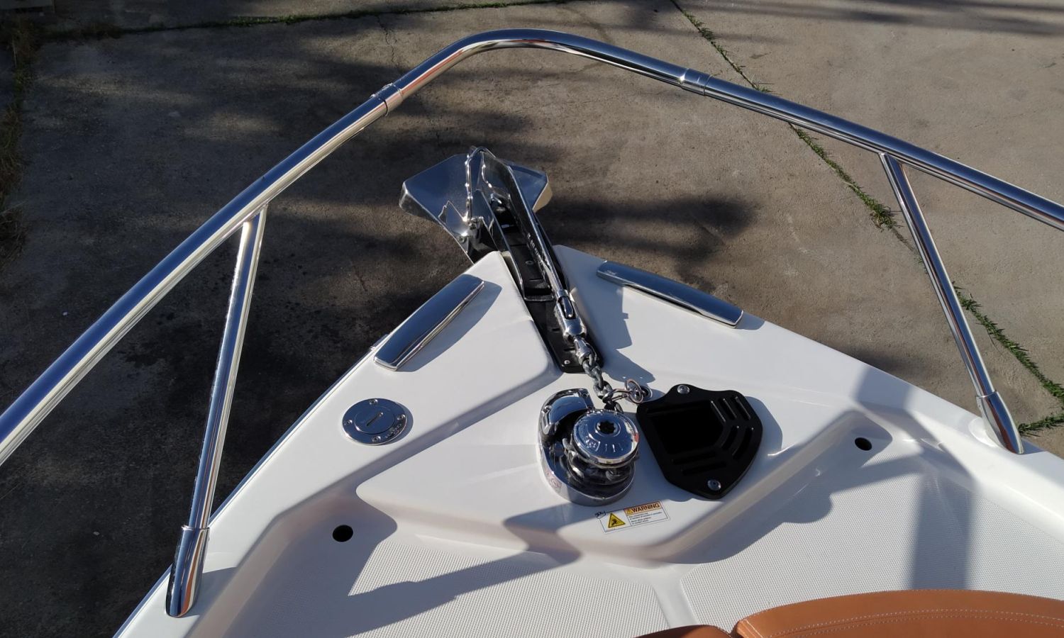 Hélice de proa - Molinete eléctrico con ancla, cadena, mando a distancia y cuentametros cadena - GPS Garmin - Instalación eléctrica 230 V con cargador de baterías - Toma puerto con cable de conexión - Toldo parasol con arquillada en inox - Bañera en teka - Plataforma de baño en teka con escalera - Colchoneta de proa y funda - Lona de fondeo - Nevera en bañera - Horno microondas - Radio Fusion con Bluetooth/USB, altavoces en cabina y bañera, amplificador, subwoofer y mando a distancia en la bañera - Mesa interior convertible en cama - WC con depósito de aguas negras - Antifouling.Descripción embarcación
