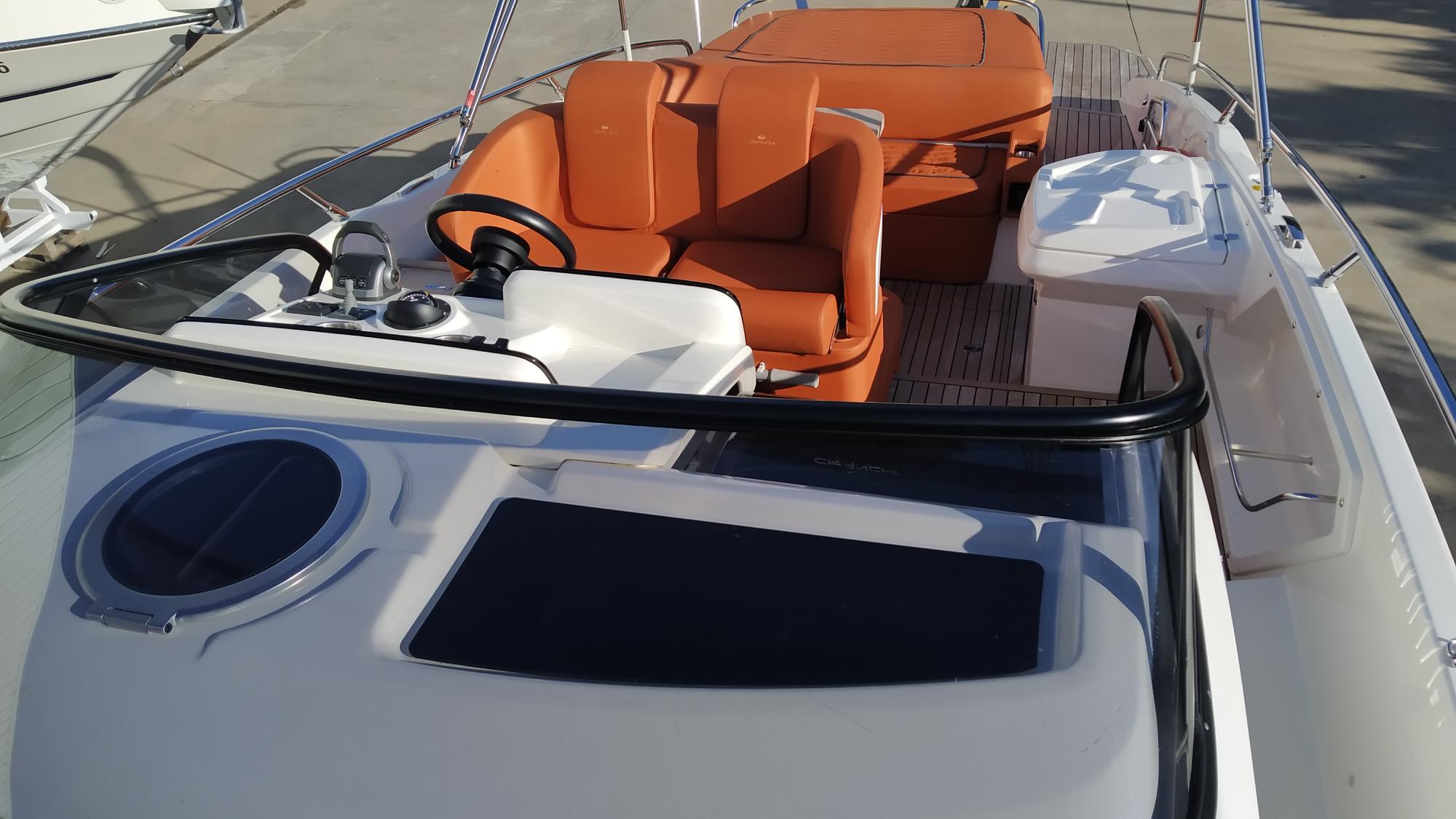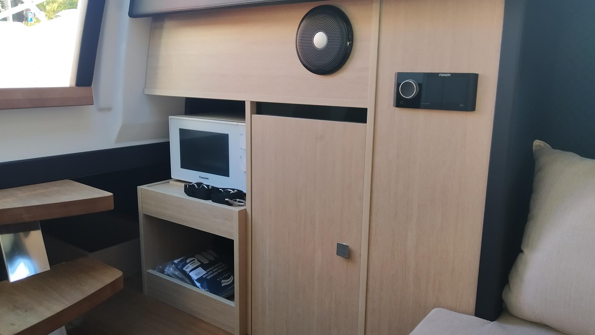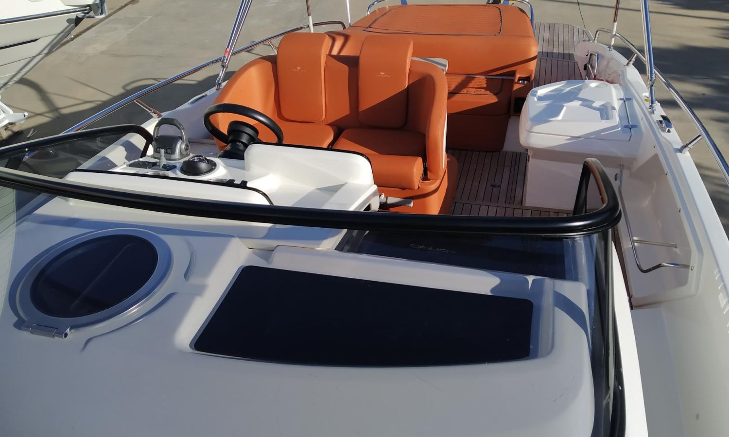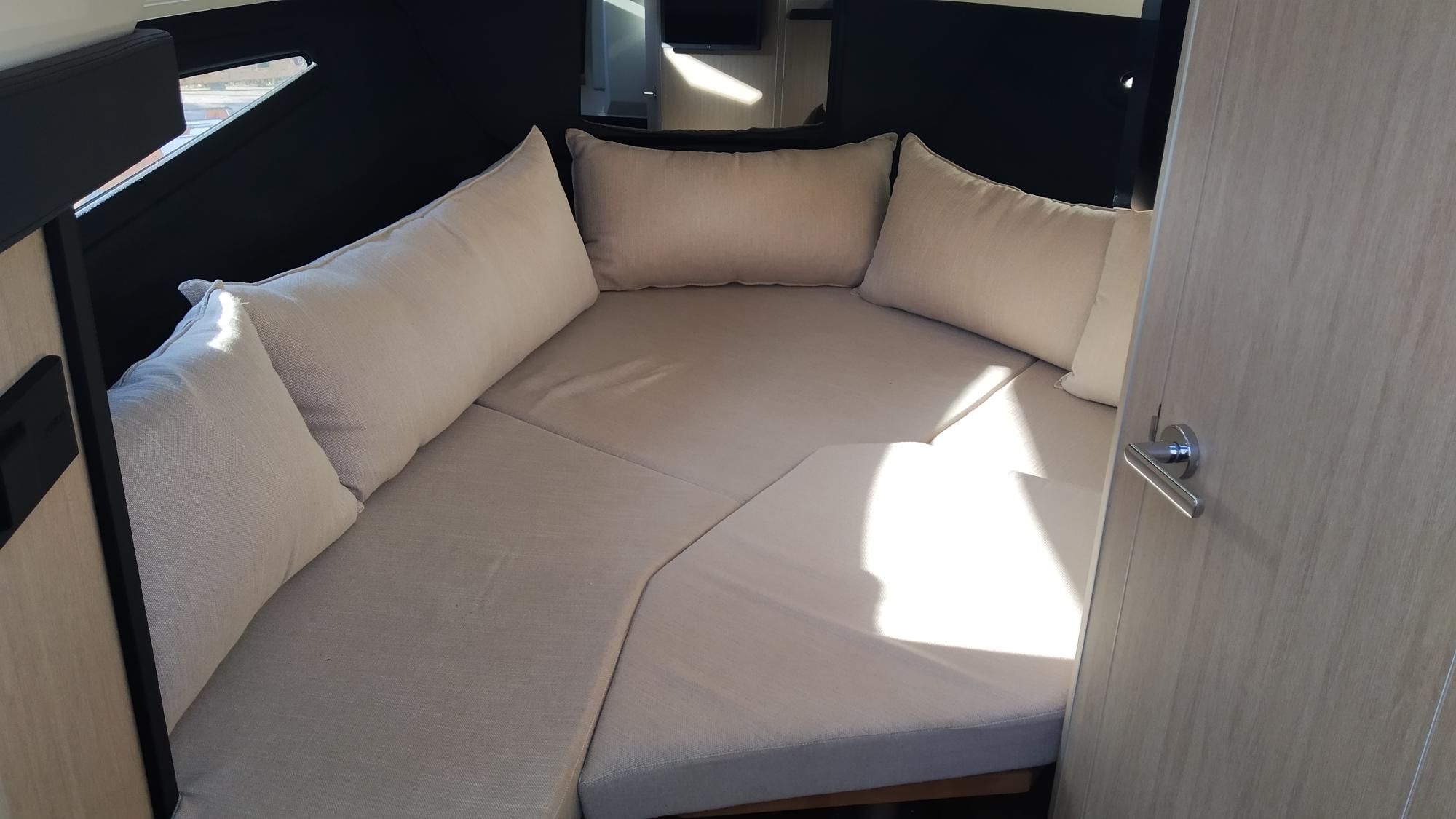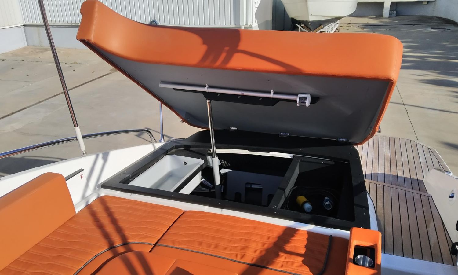 Hélice de proa - Molinete eléctrico con ancla, cadena, mando a distancia y cuentametros cadena - GPS Garmin - Instalación eléctrica 230 V con cargador de baterías - Toma puerto con cable de conexión - Toldo parasol con arquillada en inox - Bañera en teka - Plataforma de baño en teka con escalera - Colchoneta de proa y funda - Lona de fondeo - Nevera en bañera - Horno microondas - Radio Fusion con Bluetooth/USB, altavoces en cabina y bañera, amplificador, subwoofer y mando a distancia en la bañera - Mesa interior convertible en cama - WC con depósito de aguas negras - Antifouling.Descripción embarcación