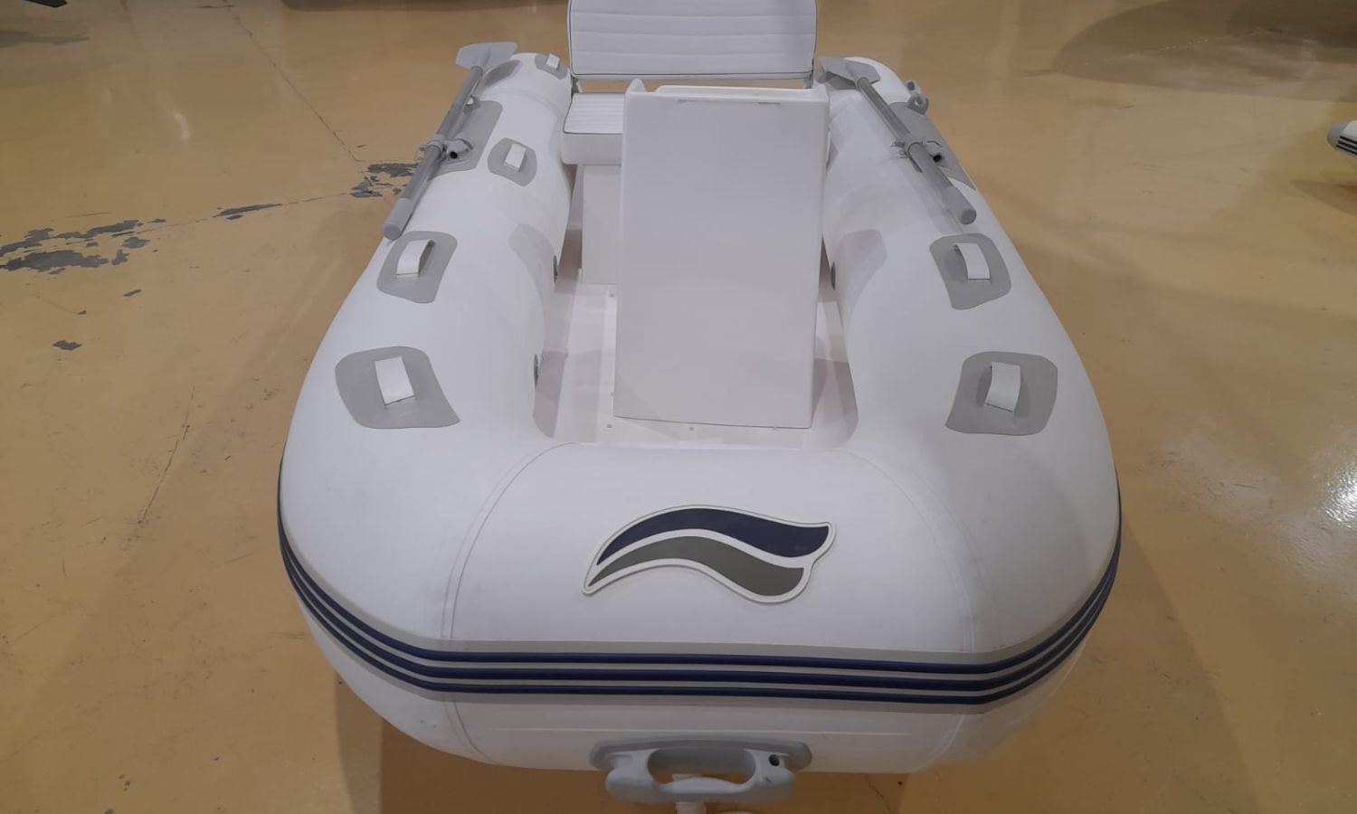 Casco carena en V - Piso antideslizante - Tejido PVC 1100 DECITEX - 3 compartimientos flotador - Consola con asiento lateral - Cofre en proa + cojín asiento - Asiento doble + cofre - 2 remos - Kit de reparación - Hinchador - Anilla de remolque.Descripción embarcación