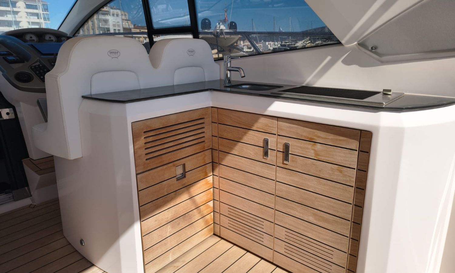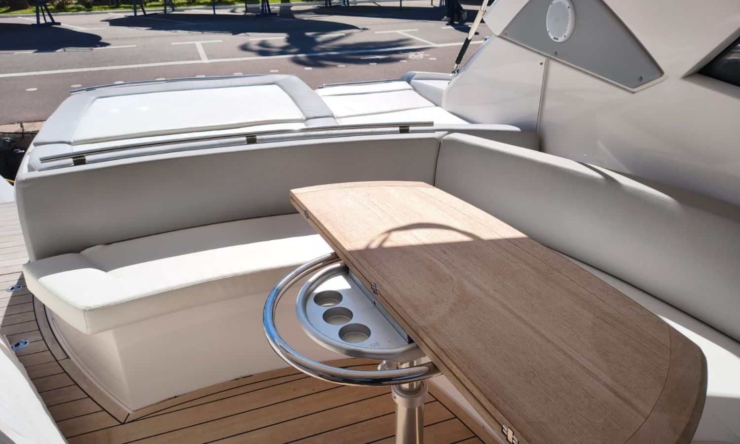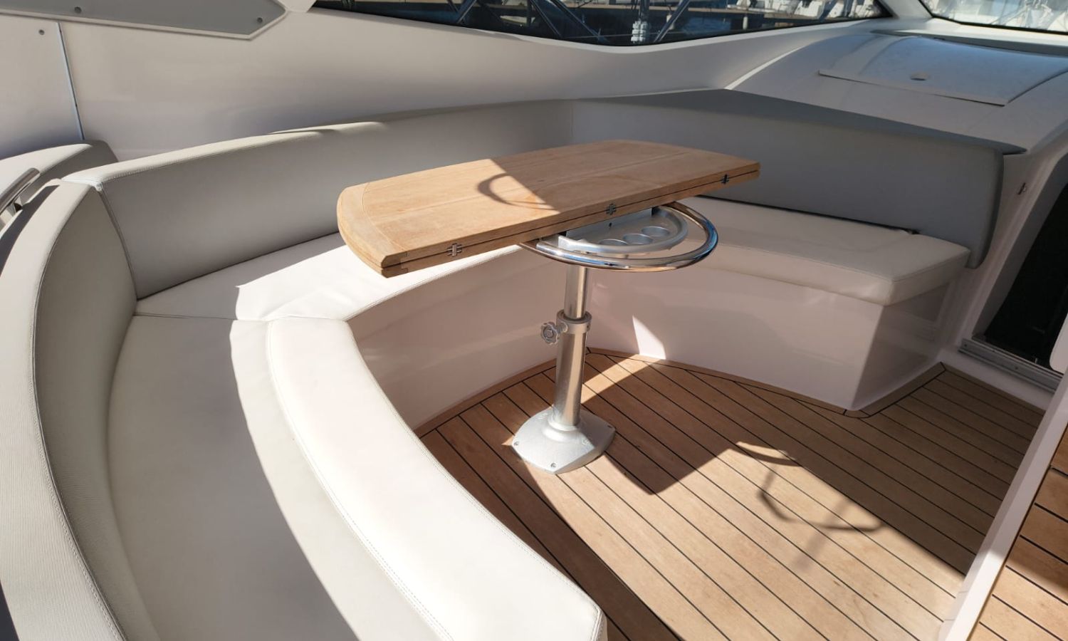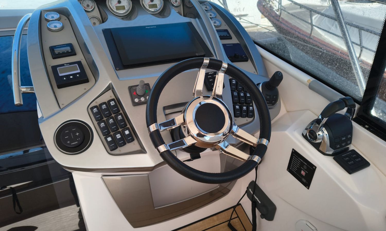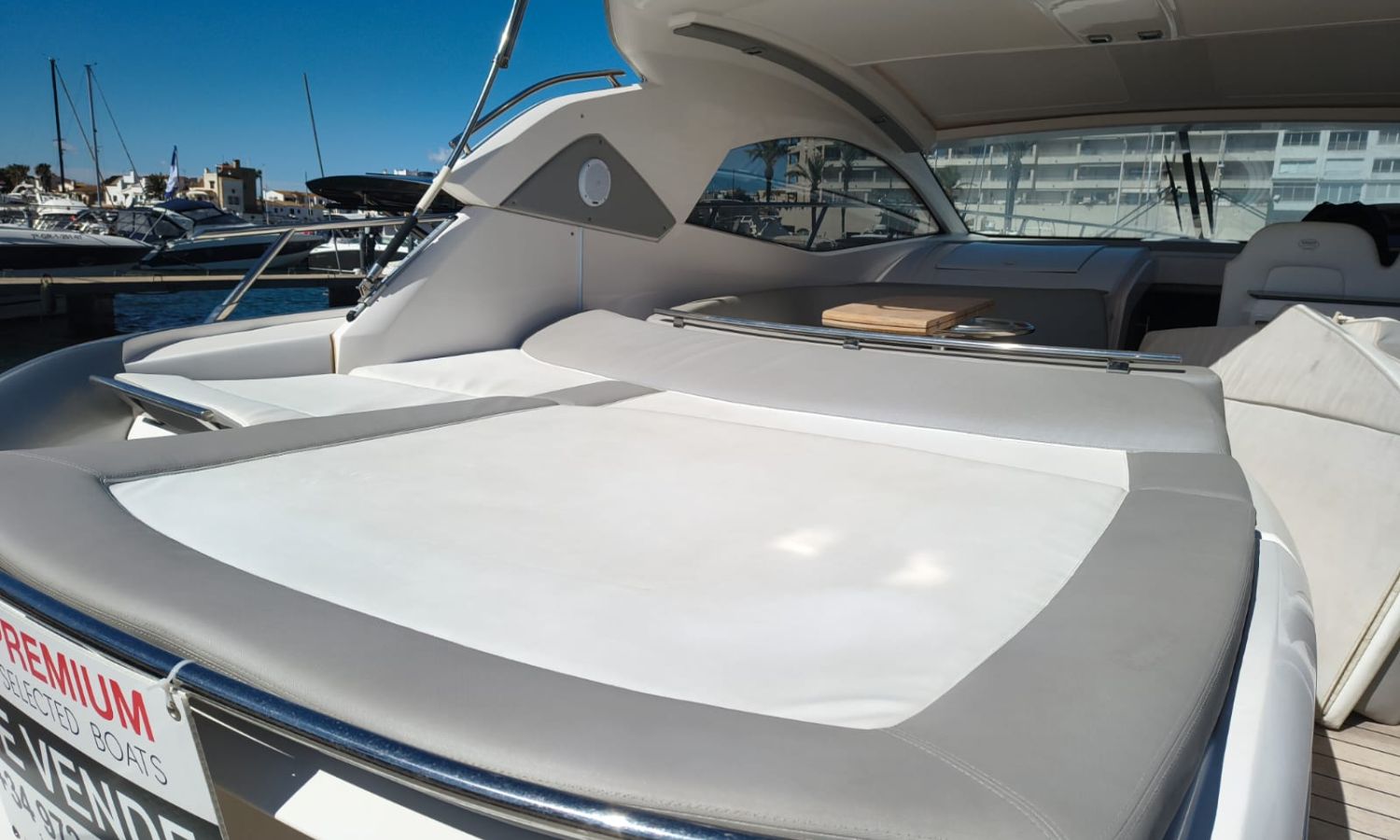 Hard Top - Toldo bimini - Hélice de proa - Flaps - Toma de puerto 220 V - Cargador de baterías - Generador - Solárium de proa - WC con depósito de aguas negras - 2 Cabinas - 2 Baños - Molinete eléctrico - Pasarela hidráulica - Mesa en la bañera - Mueble bar con fregadero - VHF - GPS/Plotter/Sonda - Piloto automático - Mandos electrónicos - Equipo de audio - Flaps - Ducha en popa - Vitro - Nevera 12 V/220 V - Microondas - Toma de agua exterior - Plataforma de baño hidráulica - JoystickDescripción embarcación