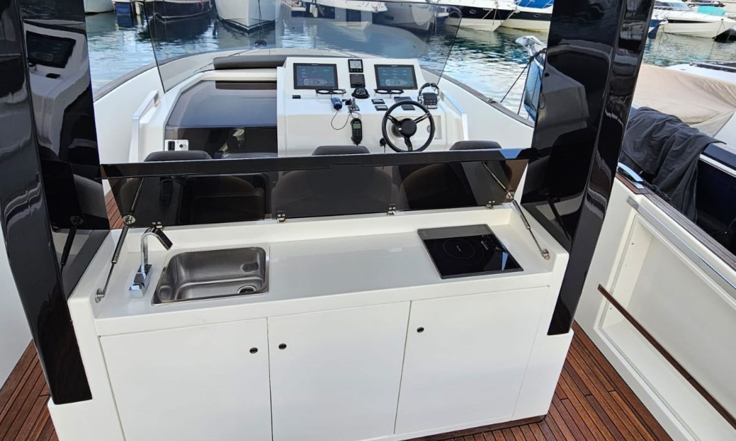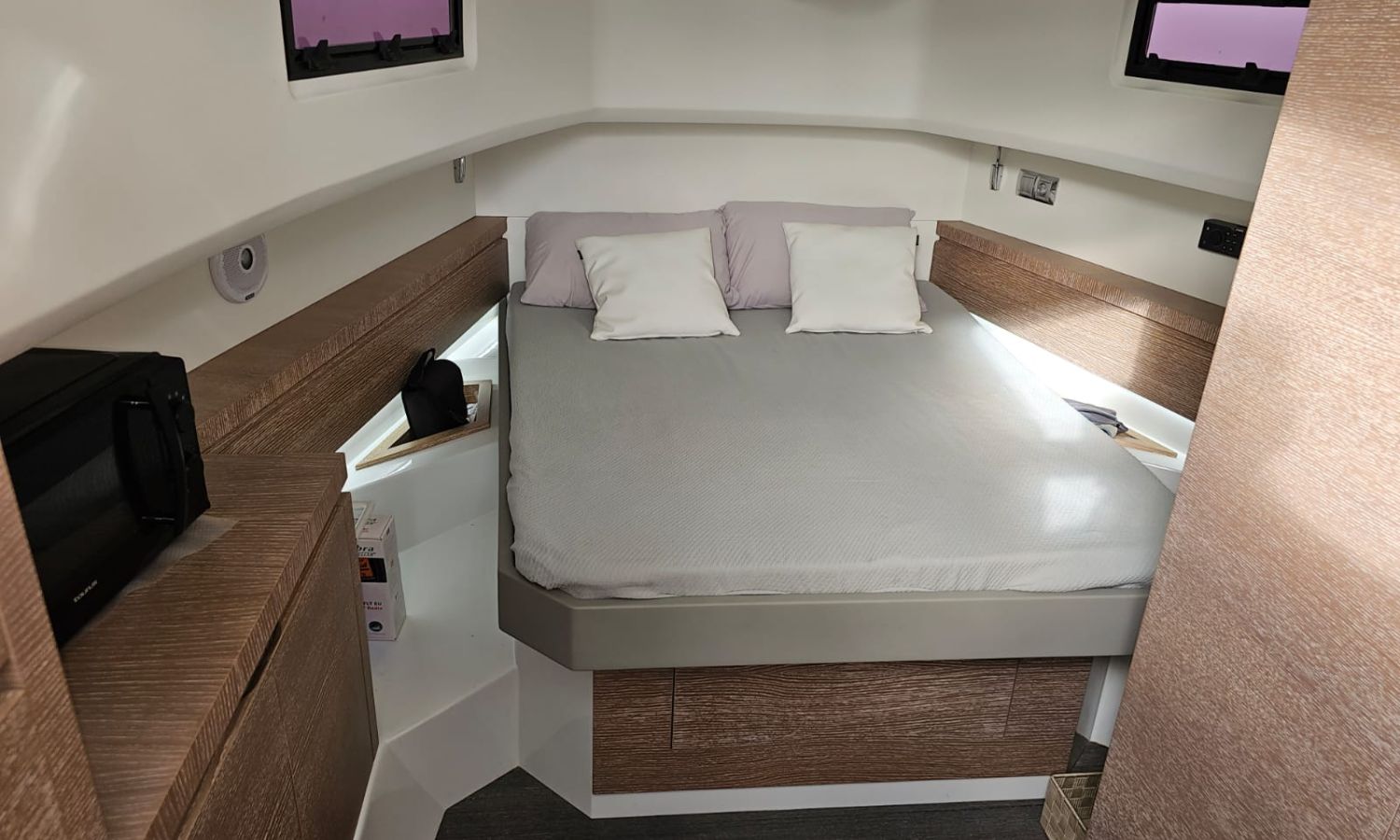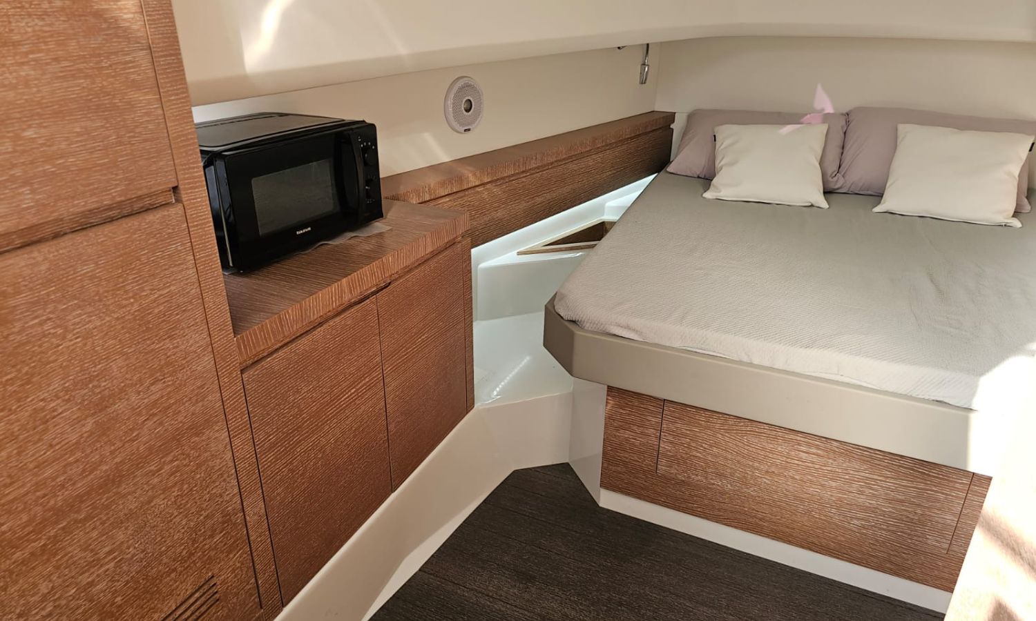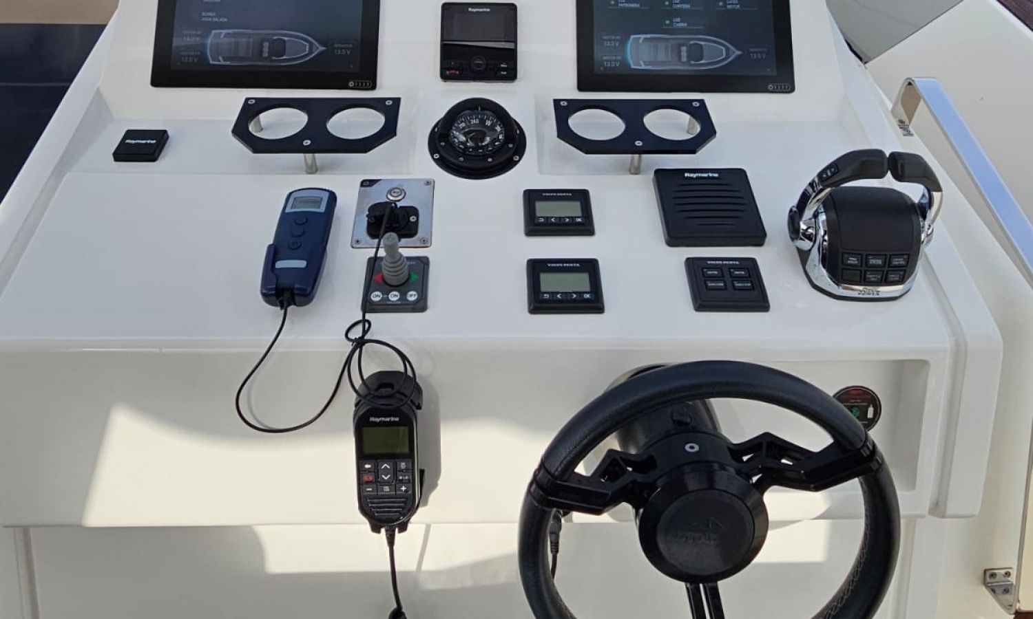Cabine d´invités avec deux lits - Réfrigérateur de cabine de 130 l - Générateur - Climatisation - Radio Fusion avec hautparleurs - Couverture pour sièges pilotage - Couverture pour bain de soleil et sièges a l´arrière - Couverture pour bain de soleil à l´avant - Éclairage de courtoisie dans le cockpit - Table de cockpit - Hard top - Taud soleil type haima à l´arrière avec mâts amovibles - Passerelle - Propulseur d´étrave - 2 écrans Raymarine Multidisplay Asion 12" - VHF - Pilote automatique - Profondimètre - Compte-chaîne - Caméra de manoeuvre - Pré-installation pour TV - Antifouling.Description du bateau