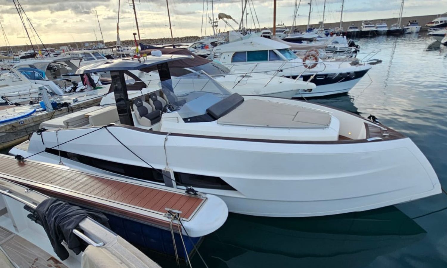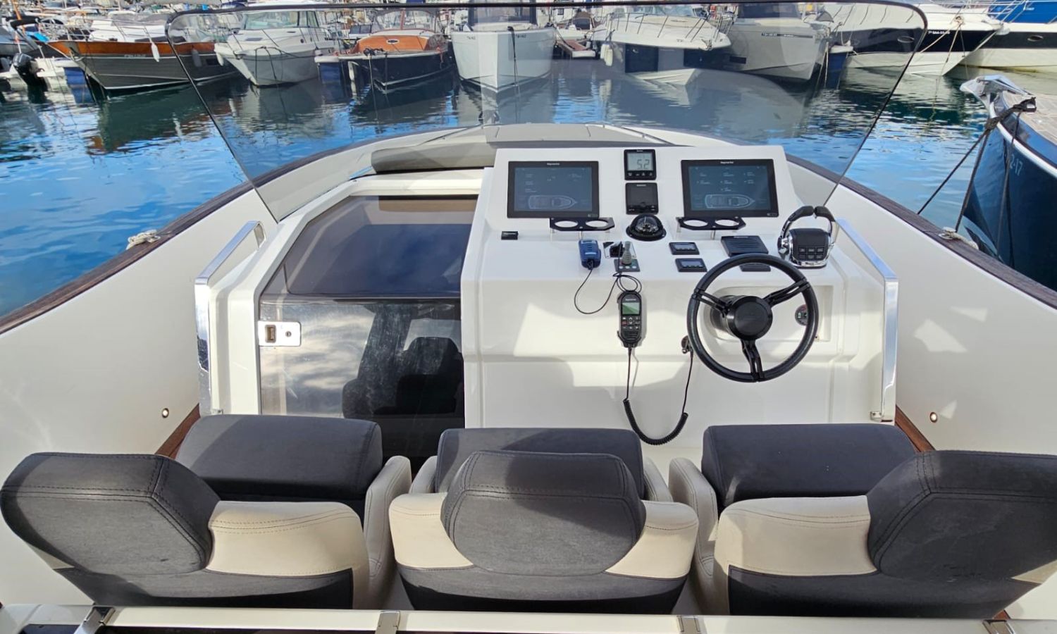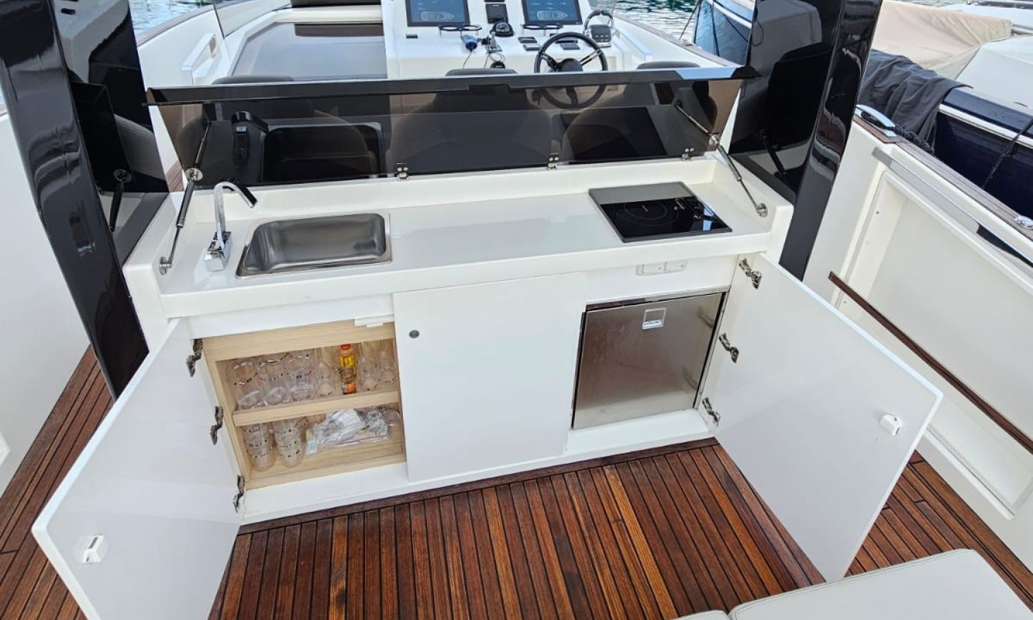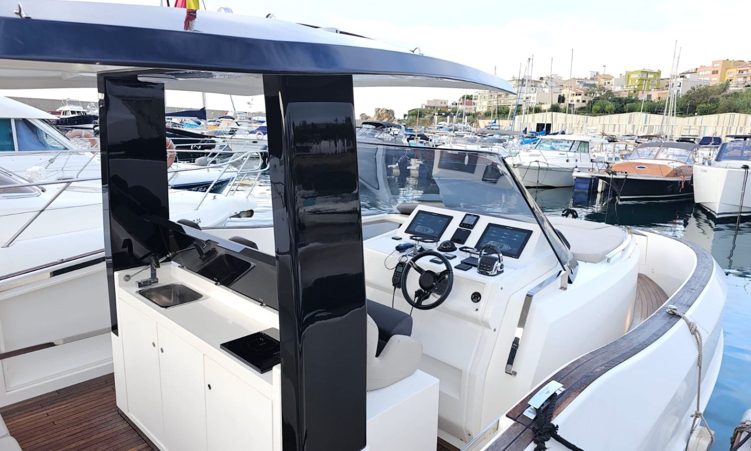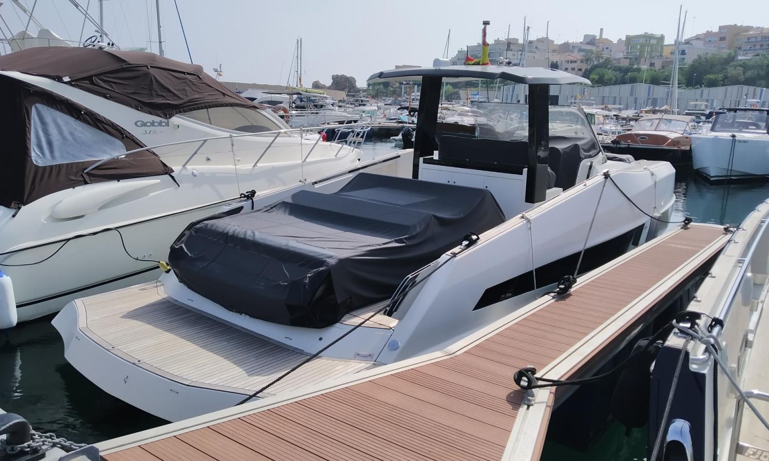 Cabine d´invités avec deux lits - Réfrigérateur de cabine de 130 l - Générateur - Climatisation - Radio Fusion avec hautparleurs - Couverture pour sièges pilotage - Couverture pour bain de soleil et sièges a l´arrière - Couverture pour bain de soleil à l´avant - Éclairage de courtoisie dans le cockpit - Table de cockpit - Hard top - Taud soleil type haima à l´arrière avec mâts amovibles - Passerelle - Propulseur d´étrave - 2 écrans Raymarine Multidisplay Asion 12" - VHF - Pilote automatique - Profondimètre - Compte-chaîne - Caméra de manoeuvre - Pré-installation pour TV - Antifouling.Description du bateau