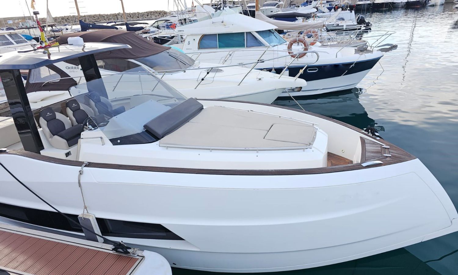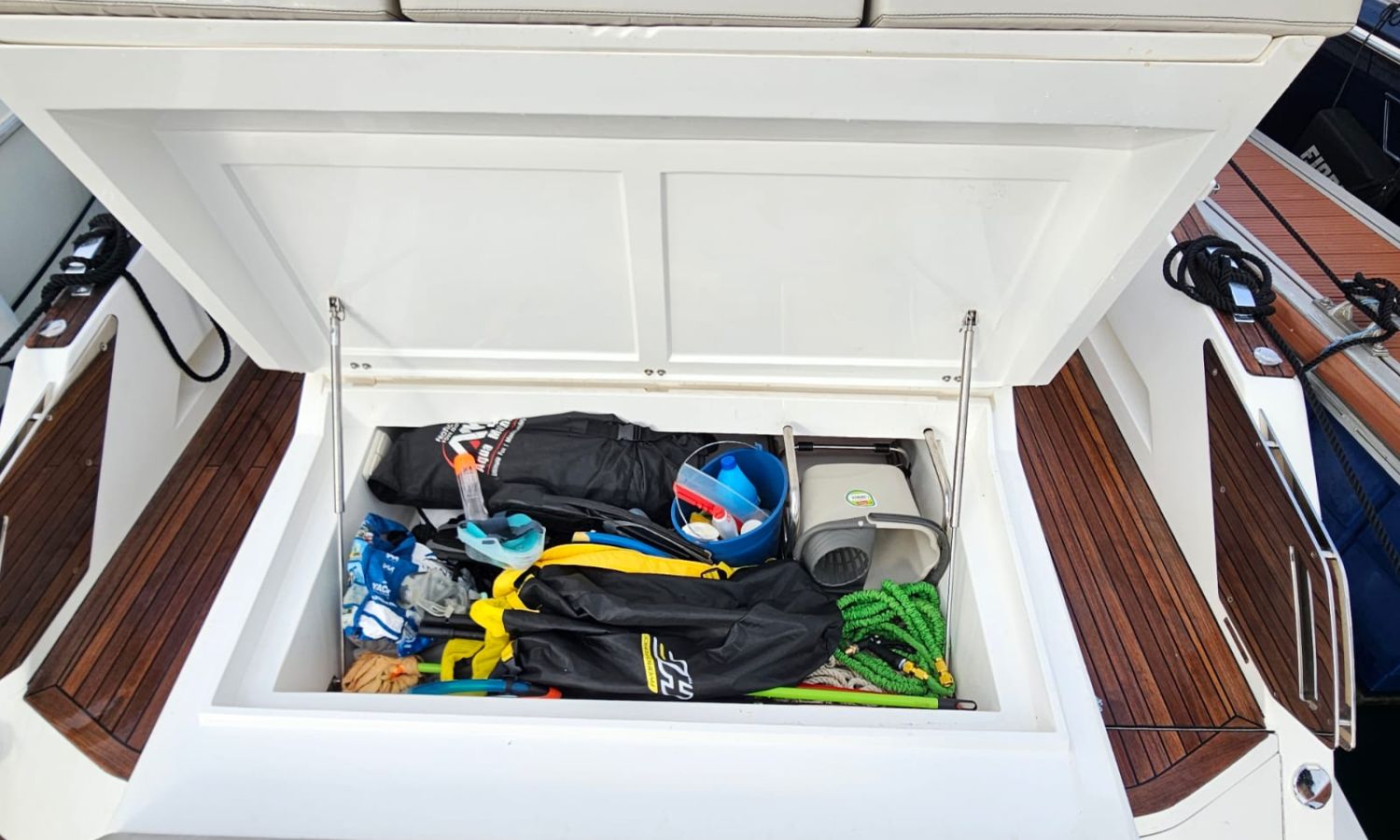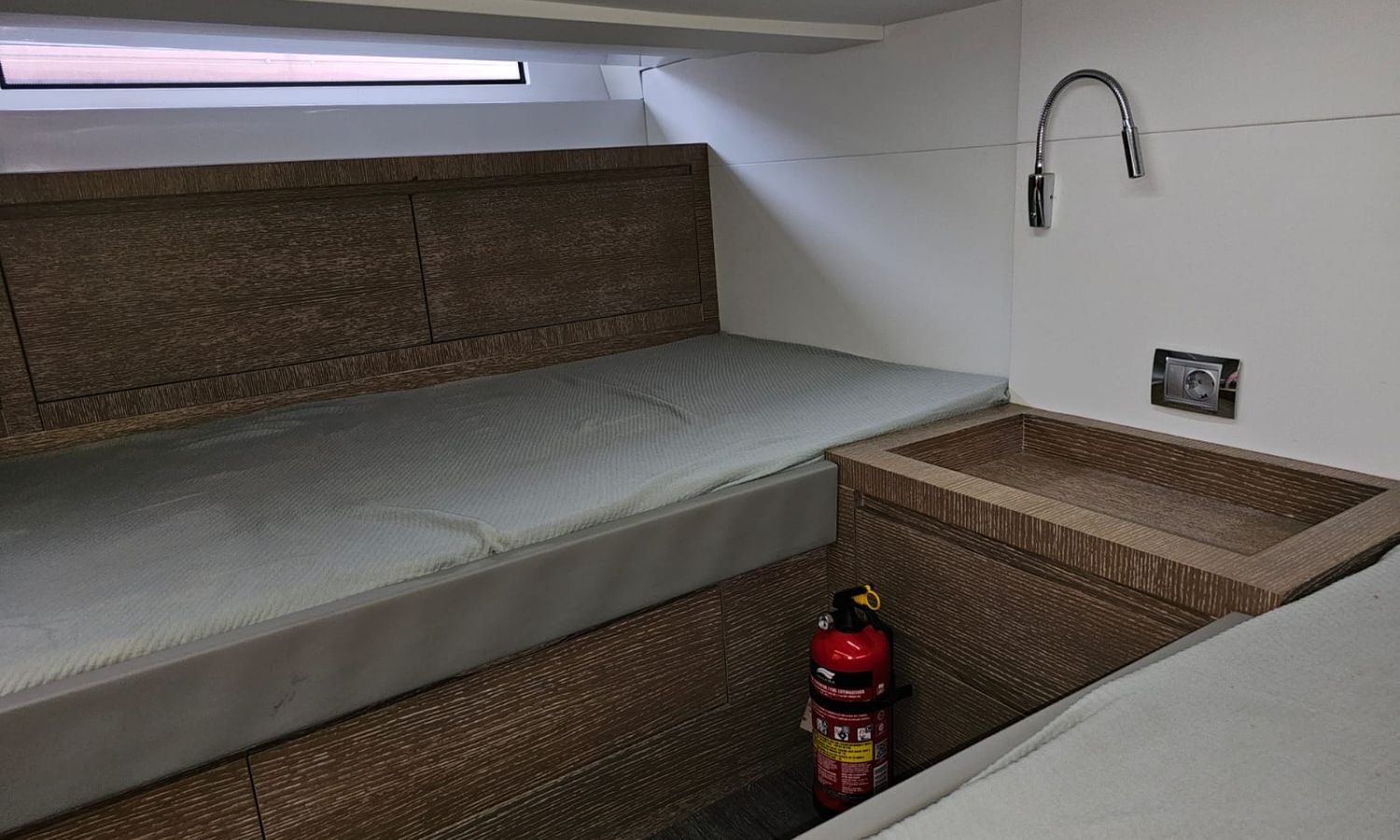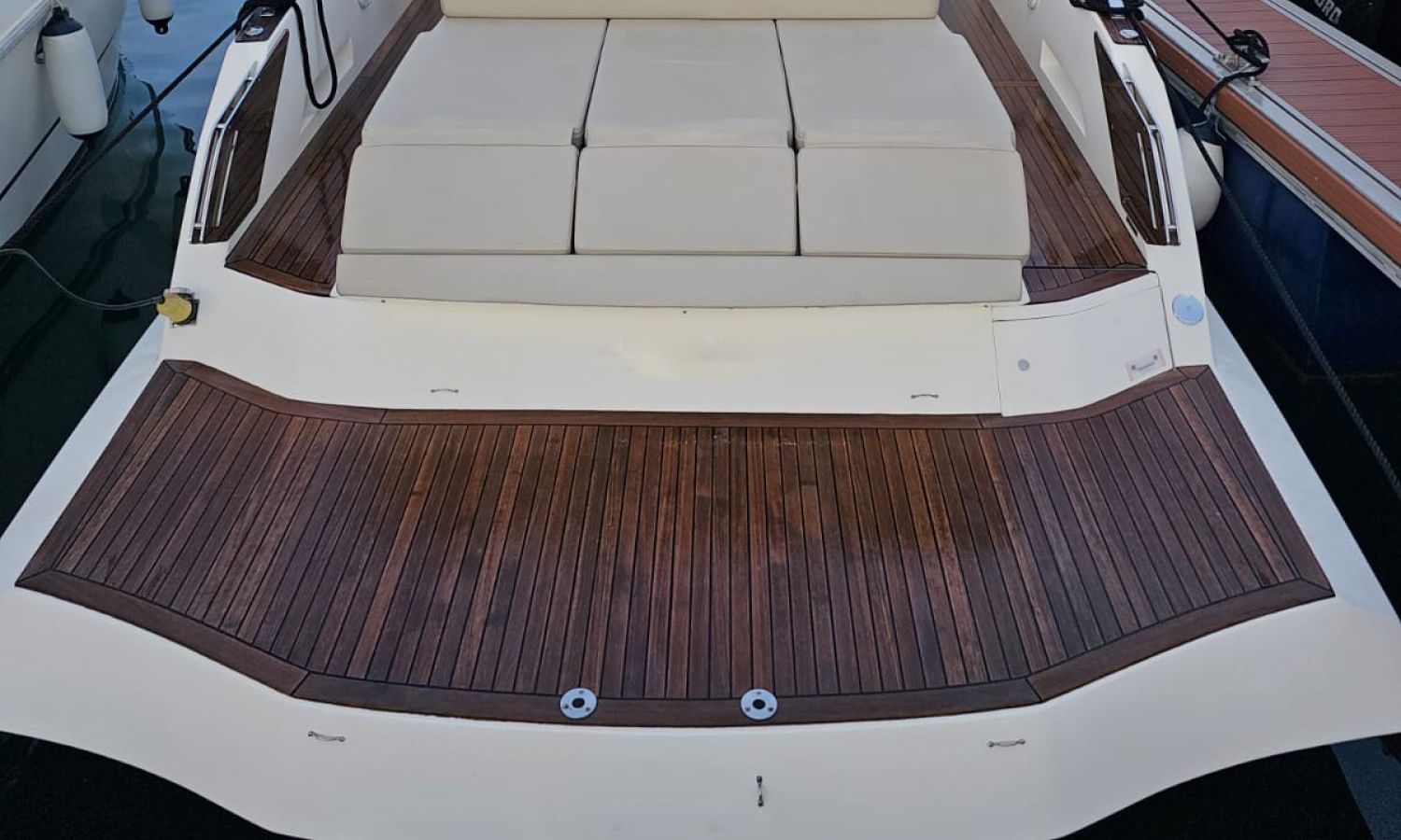 Cabine d´invités avec deux lits - Réfrigérateur de cabine de 130 l - Générateur - Climatisation - Radio Fusion avec hautparleurs - Couverture pour sièges pilotage - Couverture pour bain de soleil et sièges a l´arrière - Couverture pour bain de soleil à l´avant - Éclairage de courtoisie dans le cockpit - Table de cockpit - Hard top - Taud soleil type haima à l´arrière avec mâts amovibles - Passerelle - Propulseur d´étrave - 2 écrans Raymarine Multidisplay Asion 12" - VHF - Pilote automatique - Profondimètre - Compte-chaîne - Caméra de manoeuvre - Pré-installation pour TV - Antifouling.Description du bateau