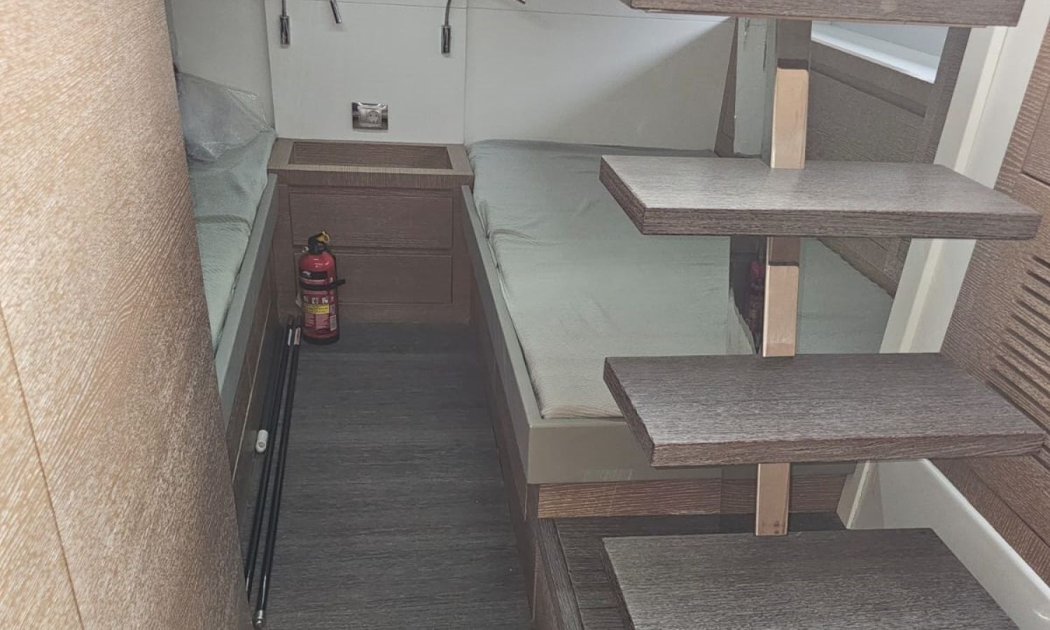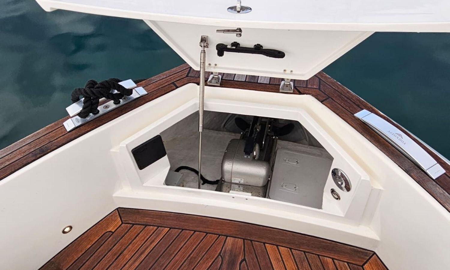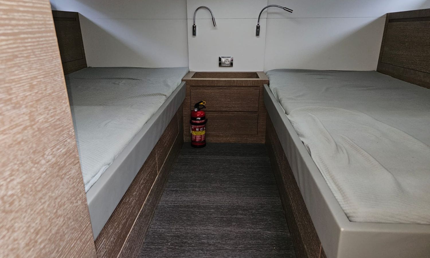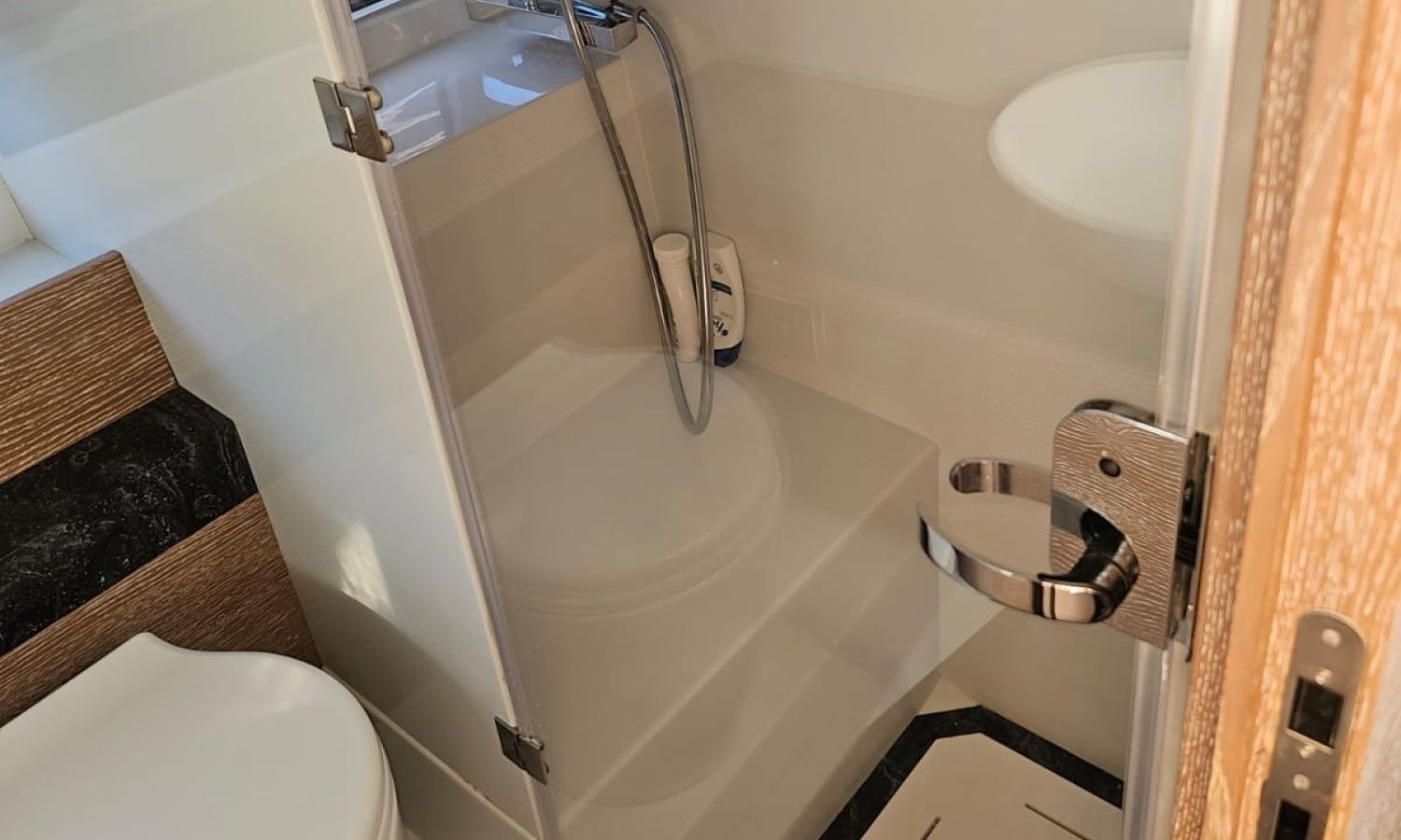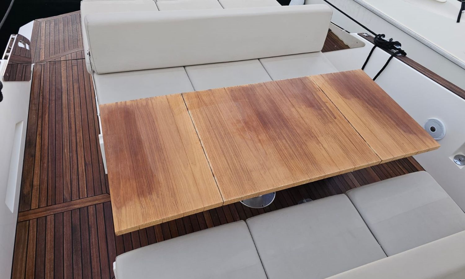 Cabine d´invités avec deux lits - Réfrigérateur de cabine de 130 l - Générateur - Climatisation - Radio Fusion avec hautparleurs - Couverture pour sièges pilotage - Couverture pour bain de soleil et sièges a l´arrière - Couverture pour bain de soleil à l´avant - Éclairage de courtoisie dans le cockpit - Table de cockpit - Hard top - Taud soleil type haima à l´arrière avec mâts amovibles - Passerelle - Propulseur d´étrave - 2 écrans Raymarine Multidisplay Asion 12" - VHF - Pilote automatique - Profondimètre - Compte-chaîne - Caméra de manoeuvre - Pré-installation pour TV - Antifouling.Description du bateau